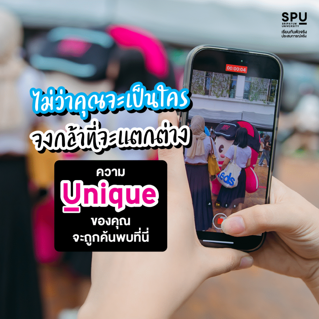 ในโลกที่ทุกคนพยายามจะเหมือนกัน SPU กลับมองหาความ “Unique” ที่แตกต่าง เราเชื่อว่าความโดดเด่นในแบบของคุณคือจุดแข็งที่ล้ำค่าที่สุด ไม่ว่าคุณจะเป็นใคร มีความสนใจแบบไหน จงกล้าที่จะแตกต่างและเป็นตัวของตัวเอง ที่นี่คือเวทีที่จะทำให้เอกลักษณ์ของคุณถูกค้นพบ ได้รับการสนับสนุน และพัฒนาต่อยอดให้กลายเป็นจุดเด่นที่ไม่มีใครสามารถเลียนแบบได้
