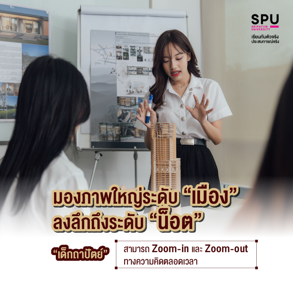 เพราะสถาปนิกต้องออกแบบตั้งแต่ผังเมืองที่เชื่อมโยงวิถีชีวิตผู้คน ไปจนถึงรายละเอียดของวัสดุและการยึดเจาะที่เล็กที่สุด ทักษะการคิดแบบ Zoom-in และ Zoom-out จึงเป็นหัวใจสำคัญที่ช่วยให้เรามองเห็นความสัมพันธ์ของสรรพสิ่งในทุกมิติได้อย่างไร้รอยต่อ