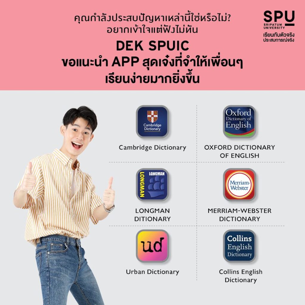 วันนี้เราจะมาเจาะลึก 6 แอป Dictionary ระดับเทพ ที่เด็ก SPUIC (Sripatum University International College) เขาคอนเฟิร์มมาว่า “จึ้งจริง” ช่วยให้ชีวิตการเรียนง่ายขึ้นแบบก้าวกระโดด ไม่ต้องมานั่งมโนความหมายเองให้เสียเวลา จะมีแอปไหนเด็ด แอปไหนโดนใจวัยรุ่นบ้าง ไปดูกันเลย