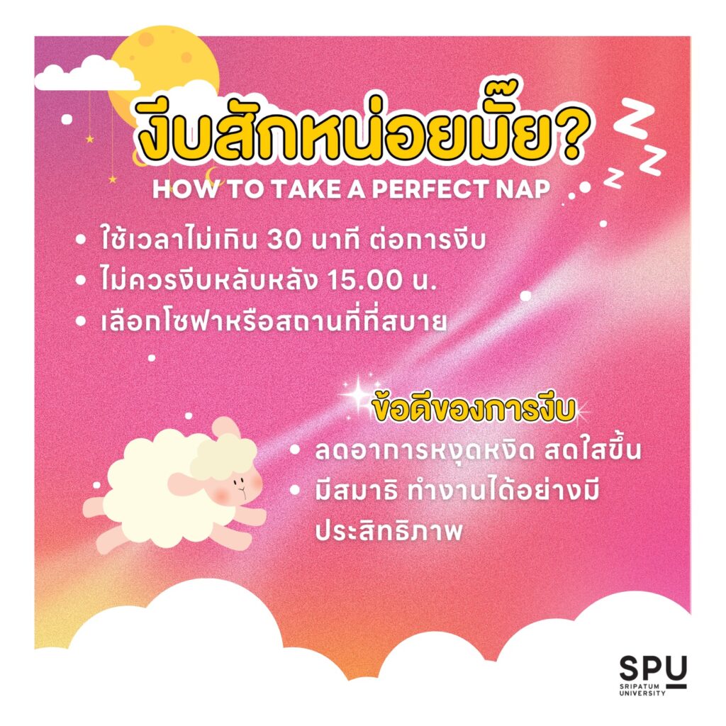 - ไม่ควรงีบหลับหลัง 15.00 น. 🚫: ถ้างีบเย็นเกินไป ระวังคืนนั้นจะตาสว่างปั่นงานไม่ออก แล้วจะกระทบวงจรการนอนหลักเอานะจ๊ะ