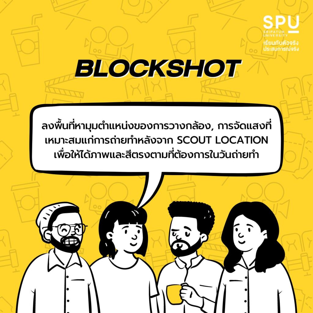 - ความสำคัญ : การบล็อกช็อตมักจะทำหลังจากที่เราไป Scout Location มาแล้ว เพื่อให้มั่นใจว่าในวันถ่ายจริง เราจะได้ภาพและสีสันที่ตรงตามที่ผู้กำกับต้องการแบบเป๊ะ ๆ ไม่ต้องเสียเวลามาลองผิดลองถูกหน้างาน