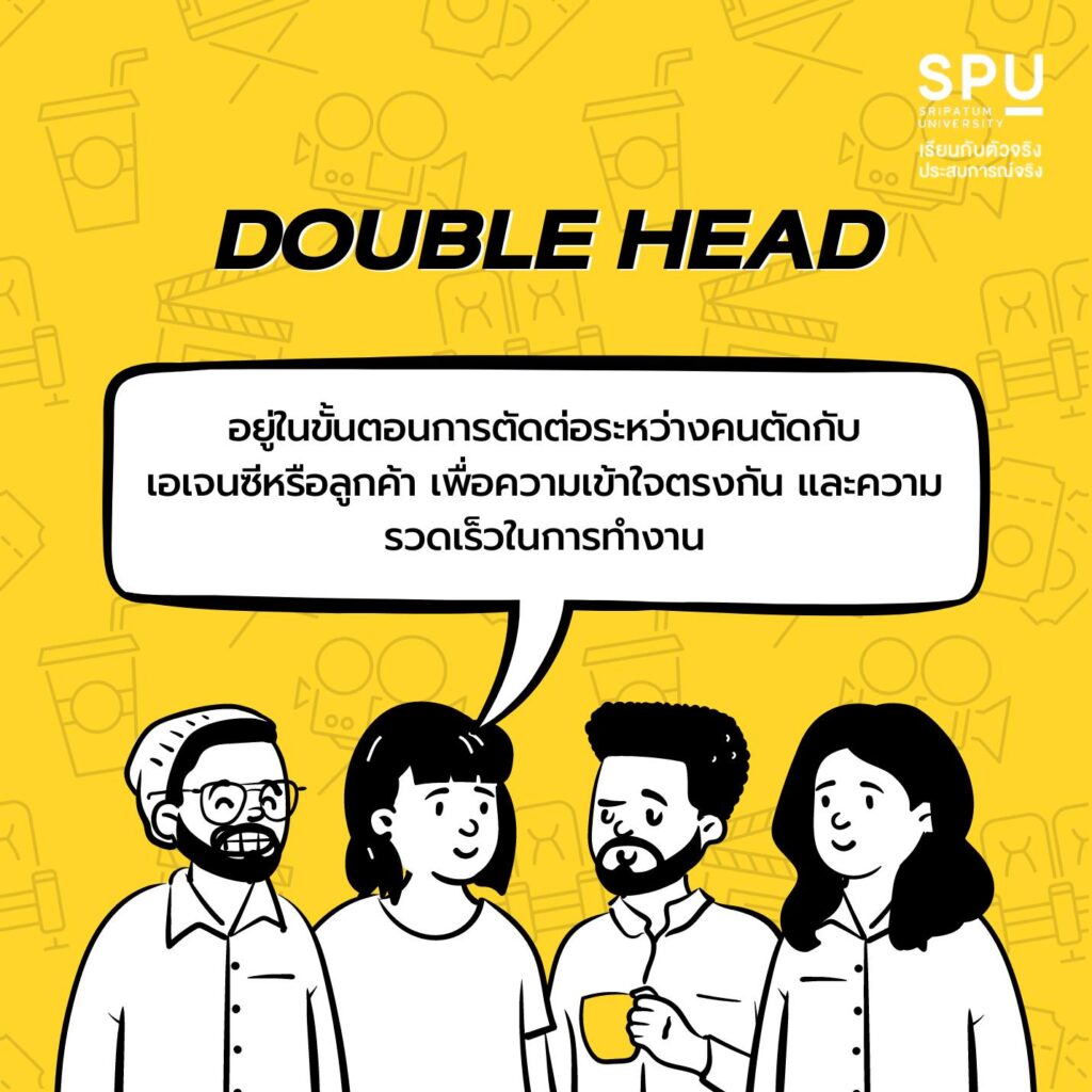 คำนี้คนนอกอาจจะไม่ค่อยคุ้น แต่ชาว Post-Production รู้ซึ้งดี! Double Head คือขั้นตอนการตัดต่อที่คนตัดต่อต้องมานั่งคุยกับเอเจนซี่หรือลูกค้าแบบตัวต่อตัว (หรือคุยพร้อมกันหลายฝ่าย) เพื่อตรวจงานและแก้ไขในรายละเอียด