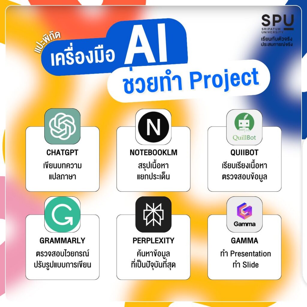 ใกล้ส่งงานแล้วแต่ยังเริ่มไม่ถูก? หรือข้อมูลมันเยอะจนงงไปหมด? เลิกเครียดได้เลย! เพราะยุคนี้เราต้องใช้ AI เข้ามาช่วยทำงานให้เบาแรงลง วันนี้รวมมาให้แล้ว 6 เครื่องมืออัจฉริยะที่จะเปลี่ยนเรื่องยากให้เป็นเรื่องง่าย ปั่นงานไวเหมือนติดจรวด!
