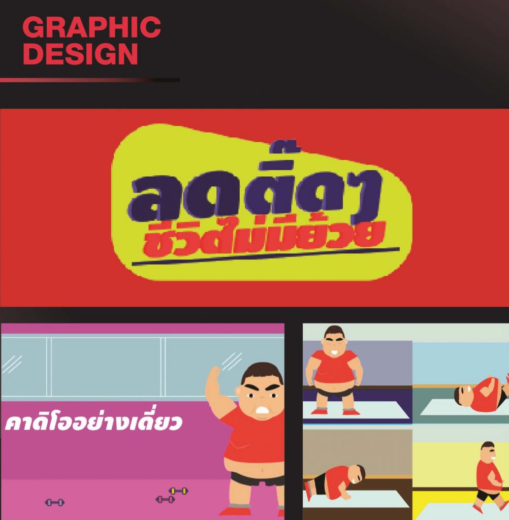 ผลงานนักศึกษาดิจิทัลมีเดีย สาขาวิชาการออกแบบกราฟิก ชื่อผลงาน รถติ๊ดๆ ชีวิตไม่มีย้วย โครงการออกแบบโมชั่นกราฟิกเรื่องการลดน้ำหนักยังไงให้ไม่ย้วย ออกแบบโมชั่น เพื่อให้ความรู้เรื่องการลดน้ำหนักให้กับคนอ้วนที่มีน้ำหนักมากๆ และมีการควบคุมอาหาร และการออกกำลังการต่างๆ เจ้าของผลงาน ชื่อ กิตติเมศร์ รังษิมาวรพัฒน์ Facebook : KITTIMET RANGSIMAVORPHAT ศิษย์เก่าวิทยาลัยเทคโนโลยีสยามบริหารธุรกิจ จบการศึกษาจาก คณะดิจิทัลมีเดีย สาขาวิชาการออกแบบกราฟิก