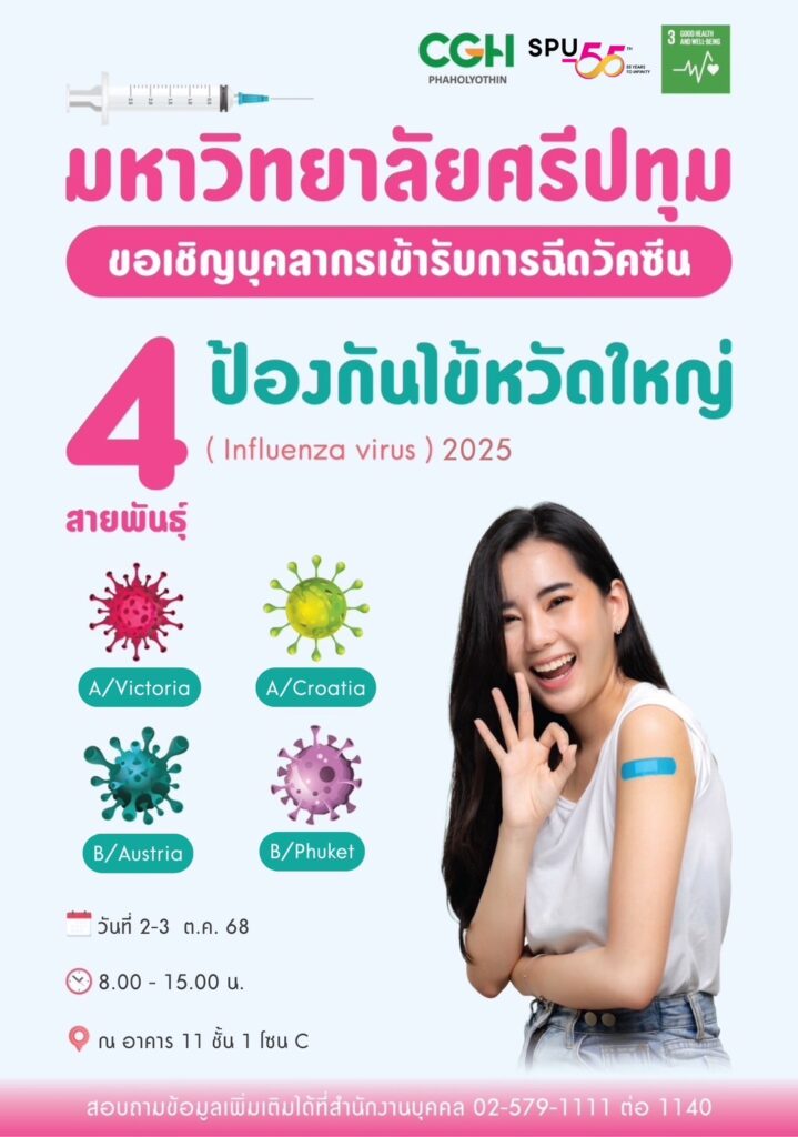 มหาวิทยาลัยศรีปทุม (SPU) ตอกย้ำความมุ่งมั่นด้านการพัฒนาที่ยั่งยืนและการดูแลสุขภาพชุมชน ด้วยการจัดโครงการฉีดวัคซีนป้องกันไข้หวัดใหญ่ให้แก่บุคลากรทุกคน โดยมหาวิทยาลัยเป็นผู้สนับสนุนค่าใช้จ่ายเต็มจำนวน วัคซีนครอบคลุมสายพันธุ์ล่าสุด ได้แก่ A/Victoria/4897/2022 (H1N1), A/Croatia/10136RV/2023 (H3N2), B/Austria/1359417/2021 (สายพันธุ์ B/Victoria) และ B/Phuket/3073/2013 (สายพันธุ์ B/Yamagata)