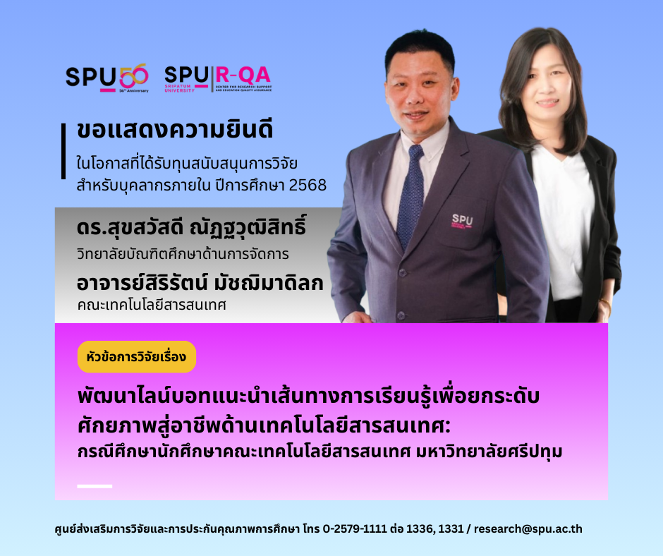 ศูนย์ส่งเสริมการวิจัยและการประกันคุณภาพการศึกษา มหาวิทยาลัยศรีปทุม ขอแสดงความยินดีกับ ดร.สุขสวัสดี ณัฏฐวุฒิสิทธิ์ วิทยาลัยบัณฑิตศึกษาด้านการจัดการ และ อาจารย์สิริรัตน์ มัชฌิมาดิลก คณะเทคโนโลยีสารสนเทศ เนื่องในโอกาสที่ได้รับทุนสนับสนุนการวิจัยสำหรับบุคลากรภายใน ปีการศึกษา 2568 โดยได้รับการสนับสนุนในหัวข้อวิจัยเรื่อง “พัฒนาไลน์บอทแนะนำเส้นทางการเรียนรู้เพื่อยกระดับศักยภาพสู่อาชีพด้านเทคโนโลยีสารสนเทศ: กรณีศึกษานักศึกษาคณะเทคโนโลยีสารสนเทศ มหาวิทยาลัยศรีปทุม”