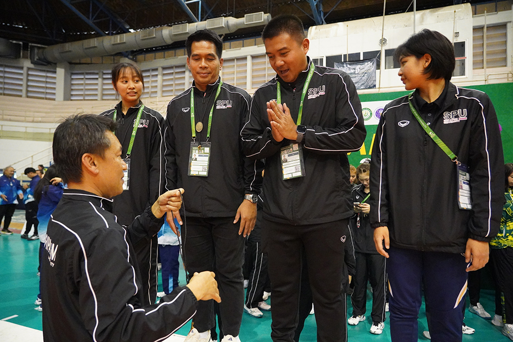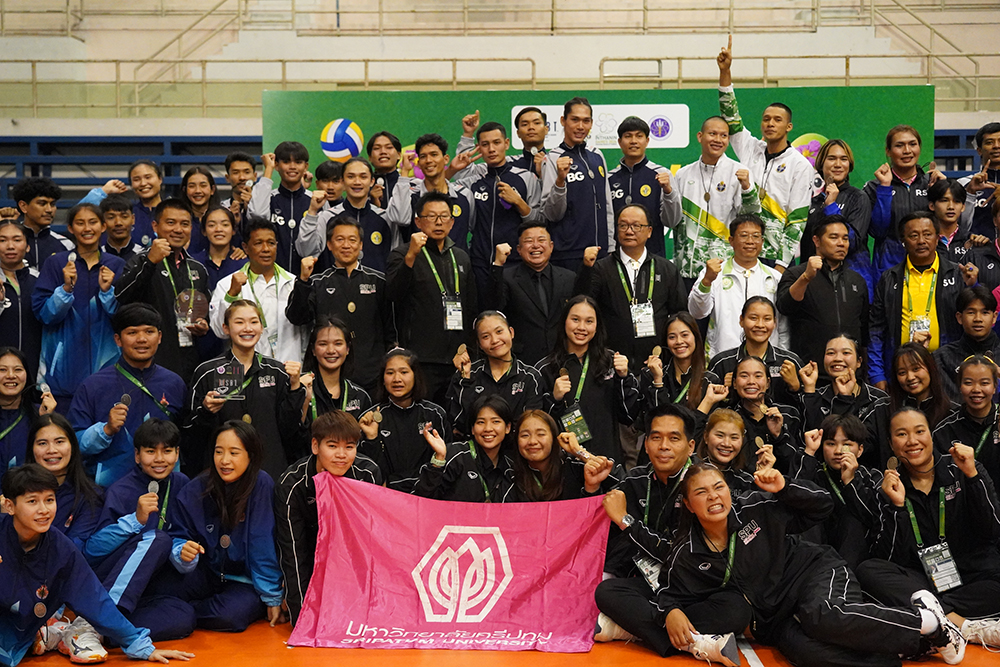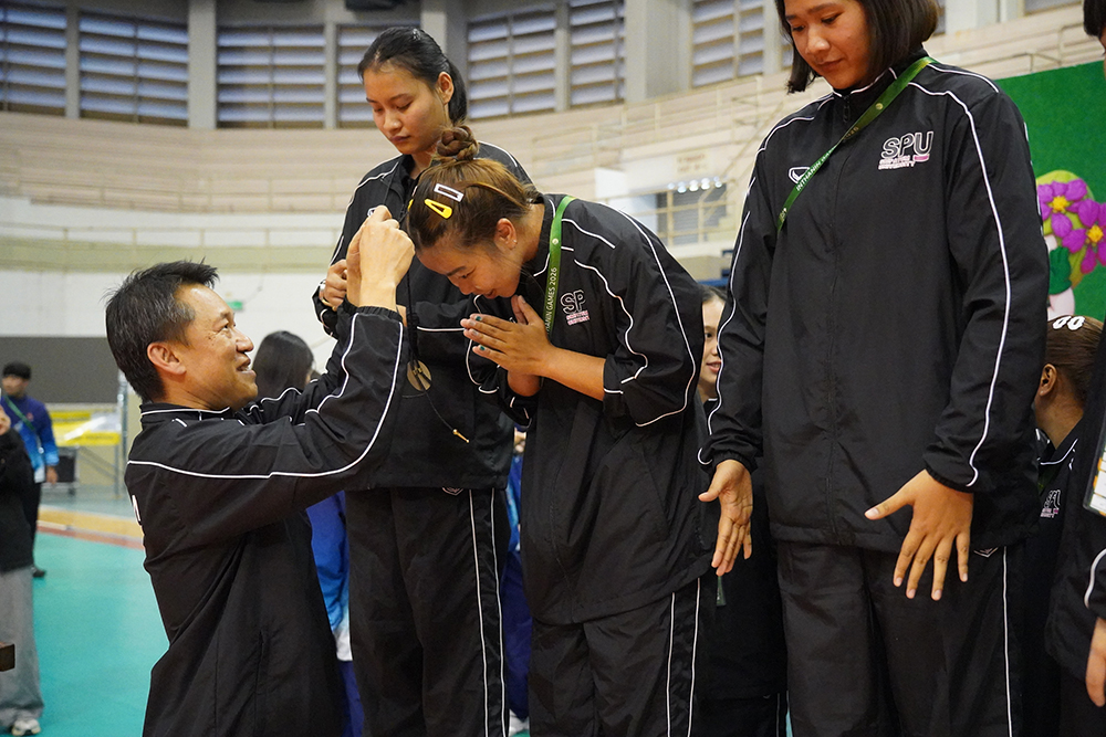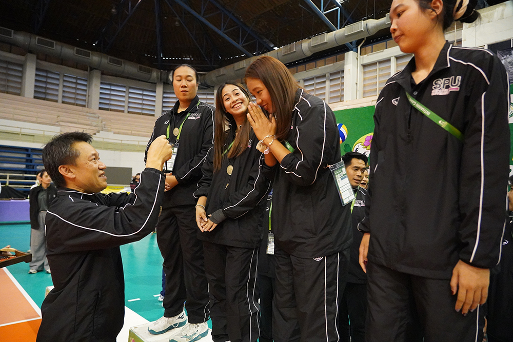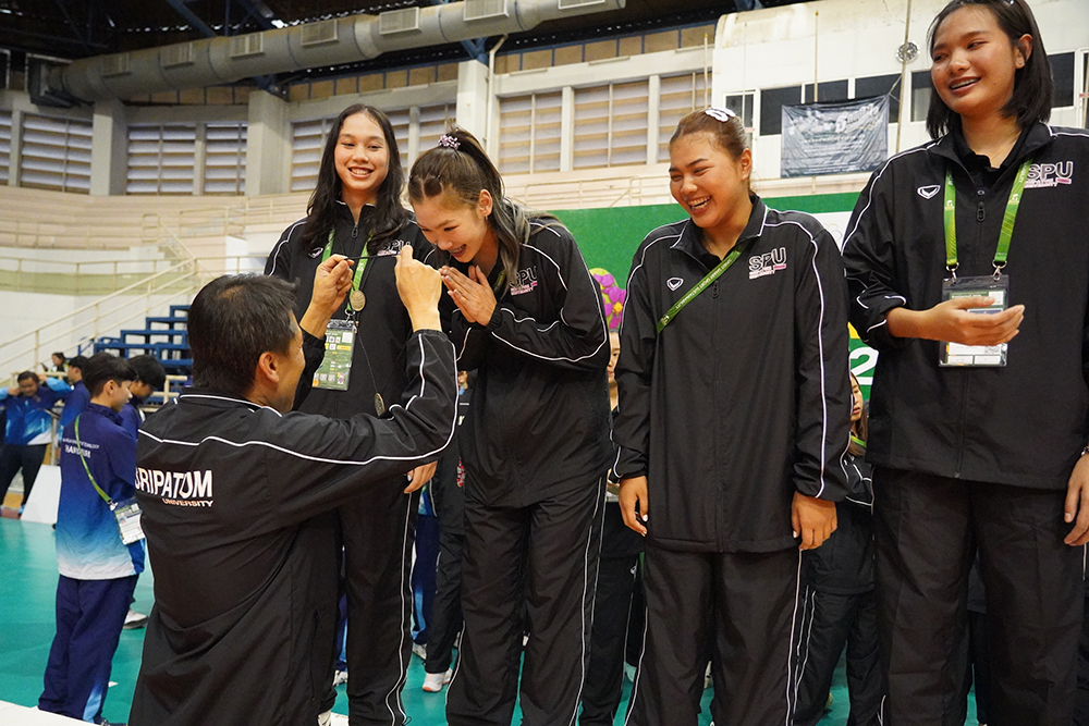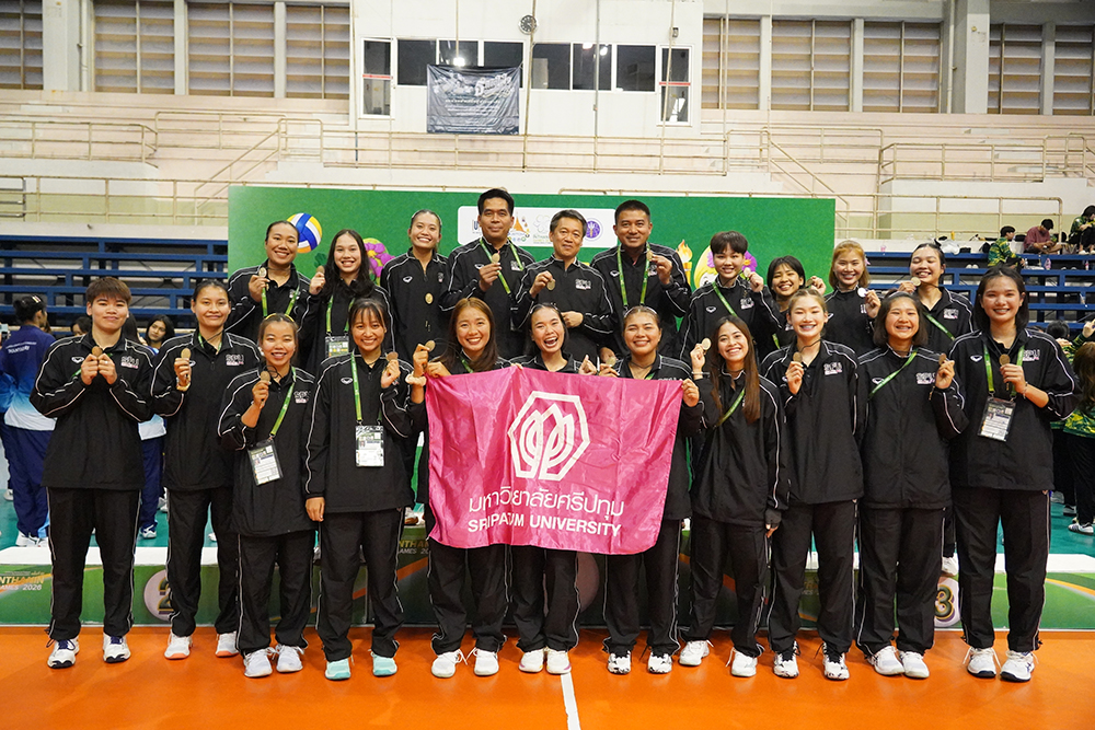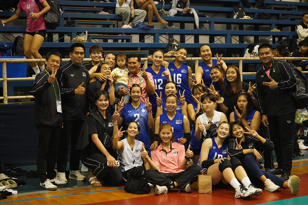 นักกีฬาวอลเลย์บอล ทีมหญิง SPU ได้แก่ ณัฐมล เหลืองวัฒนวิไล, อมลรดา ฤกษ์สว่าง, ธิดารัตน์ หมื่นพราน, วรัญญา ศรีละออง, วรกานต์ ช่างหล่อ, ปิยวรรณ พุทธรอด, นันท์นภัส มูลจะคำ, ณิชกานต์ มาลัยรักษ์, กนกพร แสงทอง, สุพัตรา ศรีระษา, สิริวัลย์ ดีแก้ว, ฑิชากร บุญเลิศ, ณิชากร วันศุกร์, ศุภานัน ศรีชัย, ศุภธิดา พุทธรอด, ศุภสุดา งามพริ้ง