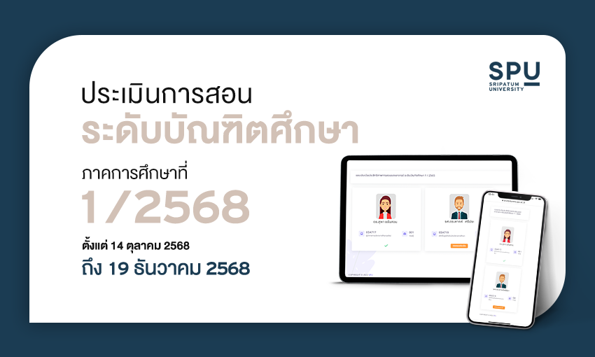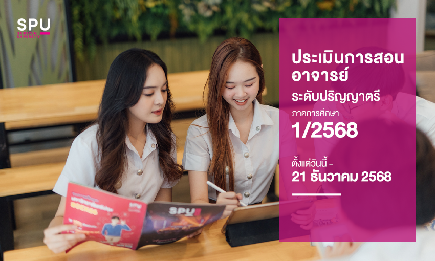 ประชาสัมพันธ์ เปิดให้ประเมินการสอนอาจารย์ ระดับปริญญาตรี ภาคการศึกษา 1/2568 ตั้งแต่วันที่ 5 พฤศจิกายน – 21 ธันวาคม 2568 สามารถประเมินผ่าน Line SCMS Student หรือ เข้าระบบ SCMS ที่ http://scms.spu.ac.th เมนูประเมินอาจารย์ผู้สอน ขั้นตอนการเข้าระบบประเมิน: https://bit.ly/stepEV2022 หากพบปัญหาติดต่อได้ที่ ศูนย์สนับสนุนและพัฒนาการเรียนการสอน Line: https://lin.ee/VaJDhRV