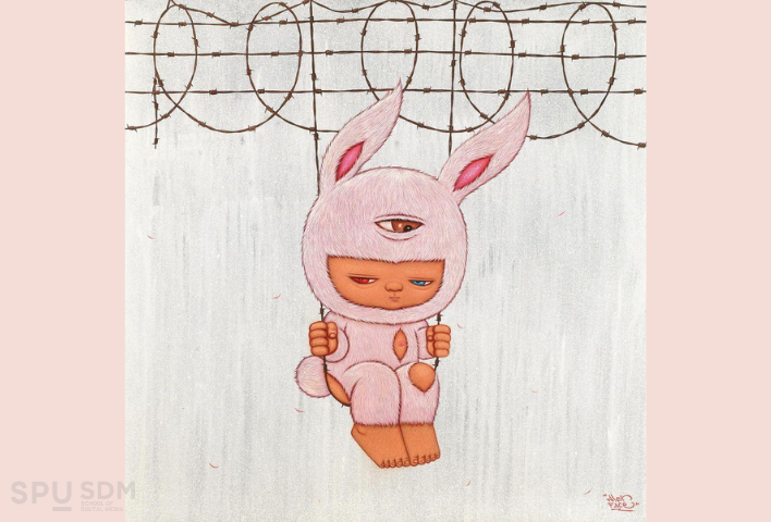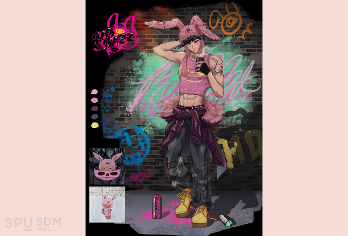 จากแรงบันดาลใจในผลงานของ Alex Face โดยเฉพาะคาแรกเตอร์กระต่ายสามตา “มาร์ดี” ผมได้ออกแบบตัวละครชายชื่อ “Rabbazz (แรบบาซ)” ผู้หลงใหลในกราฟฟิตี้และชอบสร้างสรรค์งานศิลป์บนกำแพง เขาเป็นชายหนุ่มสุขุมแต่แฝงความซื่อ และมีเอกลักษณ์ในการแต่งตัวโดดเด่น
