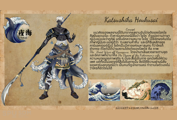 โยไคเป็นปีศาจแห่งมหาสมุทรตะวันออกที่ว่าใครก็ยำเกรง ดีไซต์นี้ได้นำผลงานโด่งดังของโฮคุไซคือ ภาพThe Great Wave off Kanagawa โดยนำมาเล่นลวดลายตามชุด และอีกภาพที่นำมาคือ The Dream of the Fisherman’s wife ความหมายของภาพจริงๆนั้นจะสื่อไปในทาง ถูกบังคับให้ร่วมเพศ แต่ทั้งนี้ไม่อยากให้สื่อไปในทางนั้น จึงได้ตีความผ่านนิสัยของคาร์แลคเตอร์นี้ว่า เป็นคนที่ดูเจ้าอารมณ์ ทำตามใจตัวเองไม่ว่าใครก็ขัดใจไม่ได้