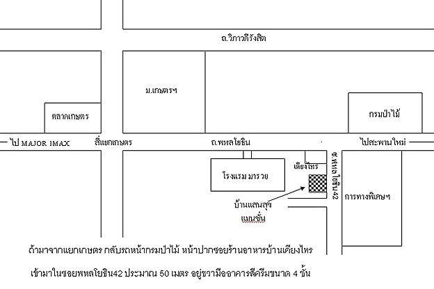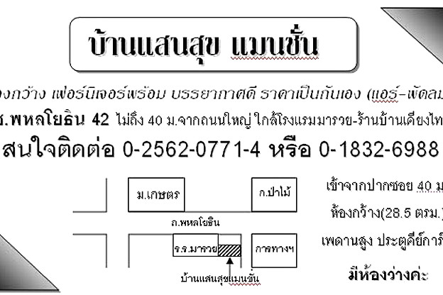 ซ.พหลโยธิน 42 ไม่ถึง 40 ม.จากถนนใหญ่ ใกล้โรงแรมมารวย เกษตร ม.เกษตร ม.ศรีปทุม สนใจติดต่อ 0-2562-0771-4
