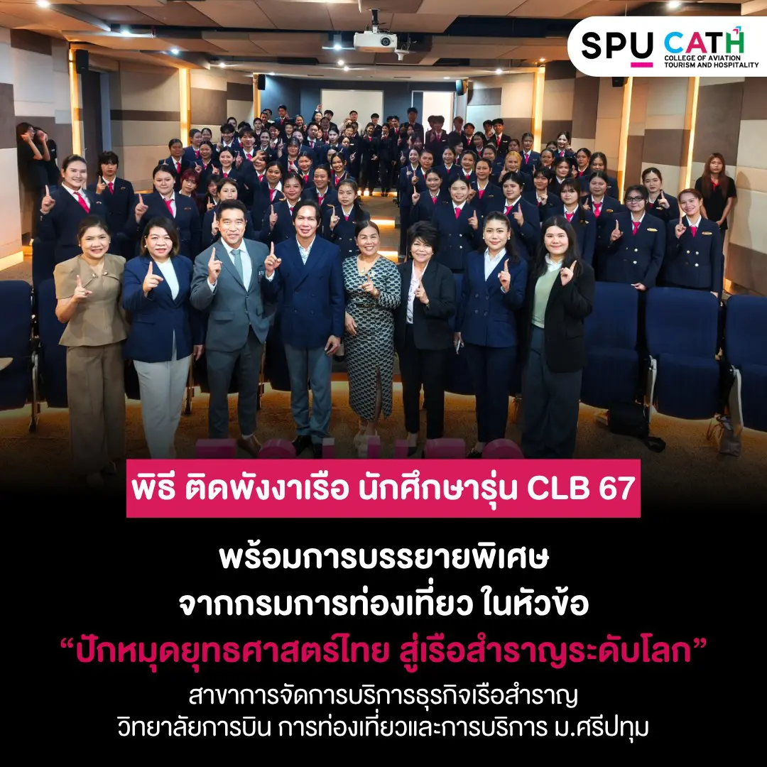 วิทยาลัยการบิน การท่องเที่ยวและการบริการ มหาวิทยาลัยศรีปทุมโดยสาขาวิชาการจัดการบริการธุรกิจเรือสำราญจัดกิจกรรมพิเศษ พิธี “ติดพังงาเรือ” สำหรับนักศึกษารุ่น CLB 67เมื่อวันที่ 26 มีนาคม