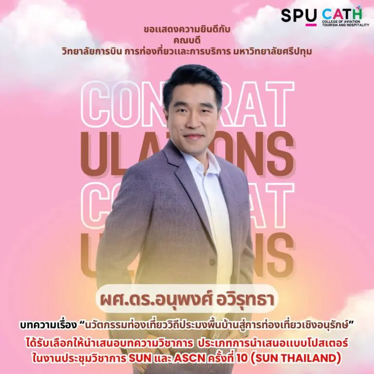 วิทยาลัยการบิน การท่องเที่ยวและการบริการ มหาวิทยาลัยศรีปทุมขอร่วมแสดงความยินดีกับ ผู้ช่วยศาสตราจารย์ ดร.อนุพงศ์ อวิรุทธาคณบดีวิทยาลัยการบิน การท่องเที่ยวและการบริการ ในโอกาสที่ได้รับคัดเลือกให้นำเสนอผลงานด้าน