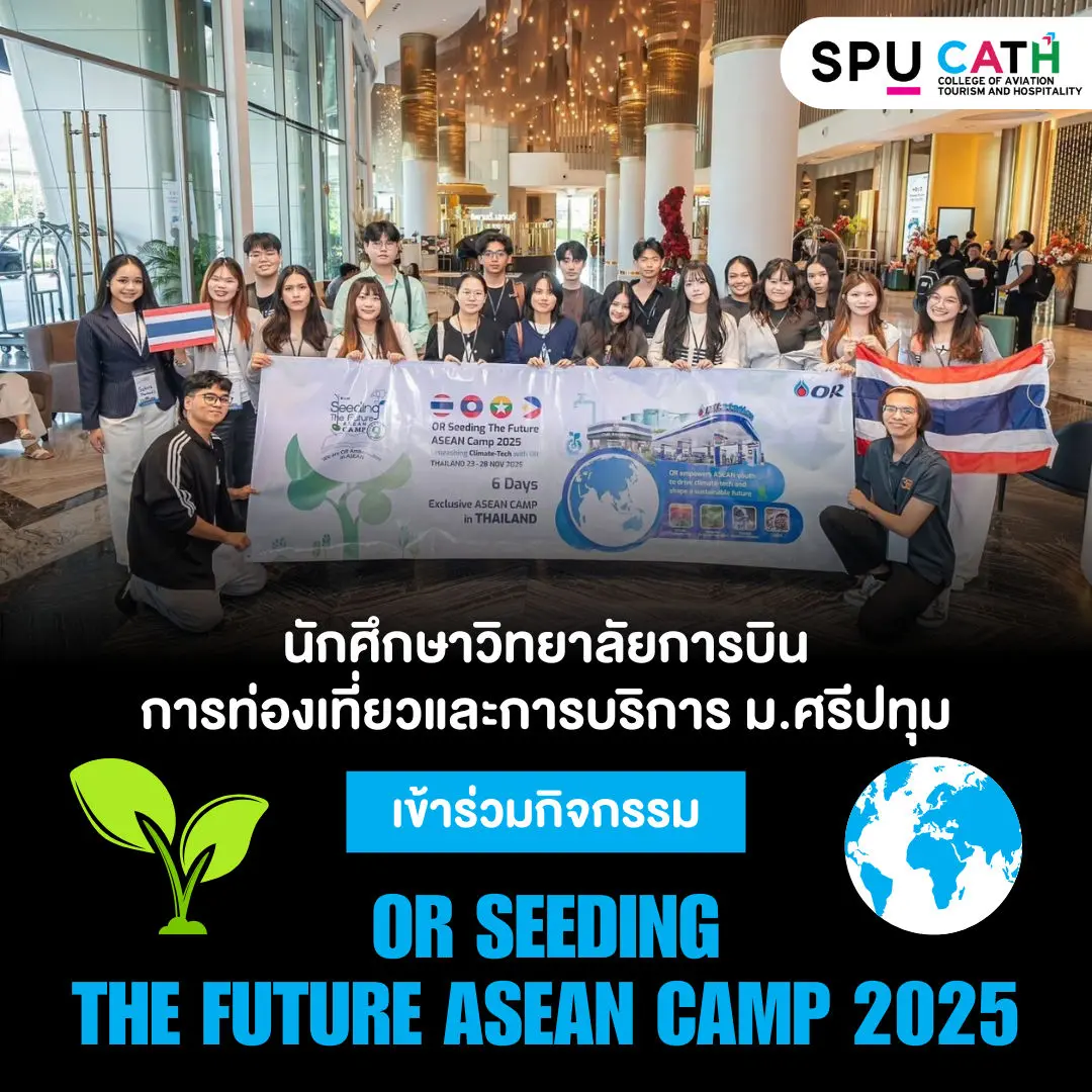 นักศึกษาวิทยาลัยการบิน การท่องเที่ยวและการบริการ มหาวิทยาลัยศรีปทุม เข้าร่วมกิจกรรมวันแรกของโครงการ “OR Seeding The Future ASEAN Camp 2025” ซึ่งจัดขึ้นระหว่างวันที่ 23–28 พฤศจิกายน 2568 โดยรวบรวมเยาวชนกว่า 50 คนจาก ไทย ลาว เมียนมา และฟิลิปปินส์ มาร่วมพัฒนาศักยภาพในมิติต่าง ๆ ตลอด 6 วันเต็ม
