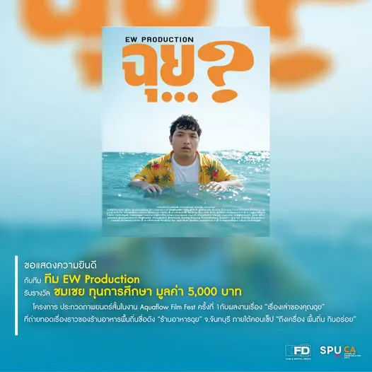 คณะนิเทศศาสตร์ สาขาภาพยนตร์และสื่อดิจิทัล มหาวิทยาลัยศรีปทุม ขอแสดงความยินดีกับ ทีม EW Production ที่คว้ารางวัลชมเชยพร้อมเงินรางวัล 5,000 บาท จากการประกวดภาพยนตร์สั้นในงาน Aquaflow Film Fest ครั้งที่ 1 กับผลงานเรื่อง “เรื่องเล่าของคุณฉุย”