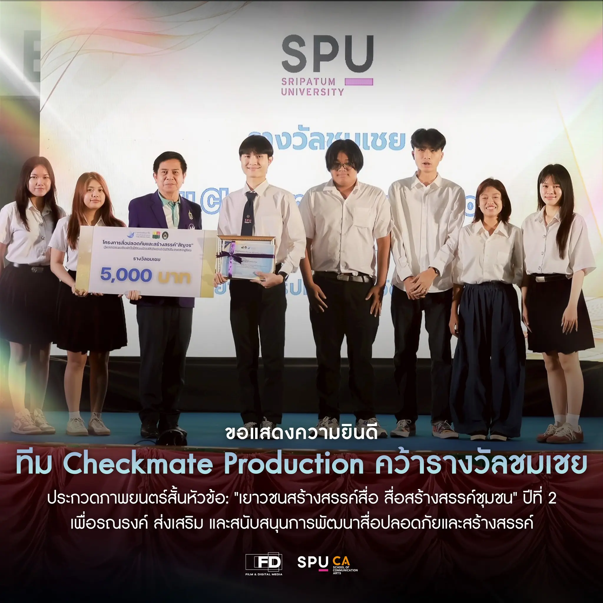 คณะนิเทศศาสตร์ สาขาภาพยนตร์และสื่อดิจิทัล มหาวิทยาลัยศรีปทุม ขอแสดงความยินดีกับทีม Checkmate Production นักศึกษา FD65 ที่คว้ารางวัลชมเชยจากการประกวดภาพยนตร์สั้นหัวข้อ “เยาวชนสร้างสรรค์สื่อ สื่อสร้างสรรค์ชุมชน” ปีที่ 2 ซึ่งจัดขึ้นเพื่อส่งเสริมการพัฒนาสื่อปลอดภัยและสร้างสรรค์ในสังคมไทย