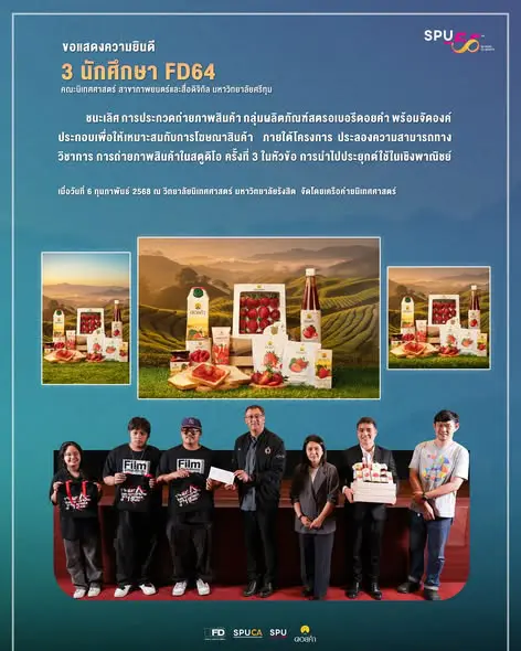 ขอแสดงความยินดีกับนักศึกษาสาขาภาพยนตร์และสื่อดิจิทัล คณะนิเทศศาสตร์ มหาวิทยาลัยศรีปทุม (FD64) ที่คว้ารางวัล ชนะเลิศ ประเภท “ความเหมาะสมในการนำไปประยุกต์ใช้ในเชิงพาณิชย์” จากเวทีการแข่งขัน การถ่ายภาพสินค้าในสตูดิโอ ครั้งที่ 3 จัดโดยเครือข่ายนิเทศศาสตร์ ณ ม.รังสิต เมื่อวันที่ 6 กุมภาพันธ์ 2568