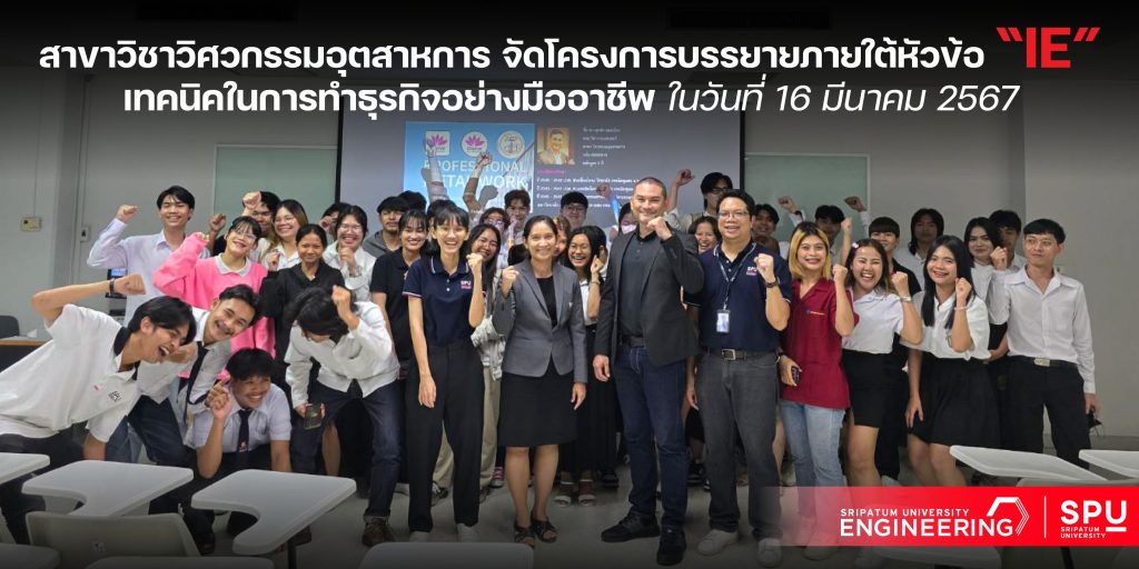 สาขาวิชาวิศวกรรมอุตสาหการ จัดโครงการบรรยายภายใต้หัวข้อ IE เทคนิคในการทำธุรกิจอย่างมืออาชีพ ในวันที่ 16 มีนาคม 2567 ได้รับเกียรติจาก คุณสุรชัย แสงเมือง กรรมการผู้จัดการ บริษัท โปรเฟสชั่นนอล เมททอล เวิร์ค จำกัด ศิษย์เก่าสาขาวิชาวิศวกรรมอุตสาหการ มาเล่าประสบการณ์การนำความรู้ไปใช้ในการสร้างธุรกิจ ให้กับน้องๆ สาขาวิชาวิศวกรรมอุตสาหการ และสาขาอื่น ๆ เพื่อเกิดแรงบันดาลใจ