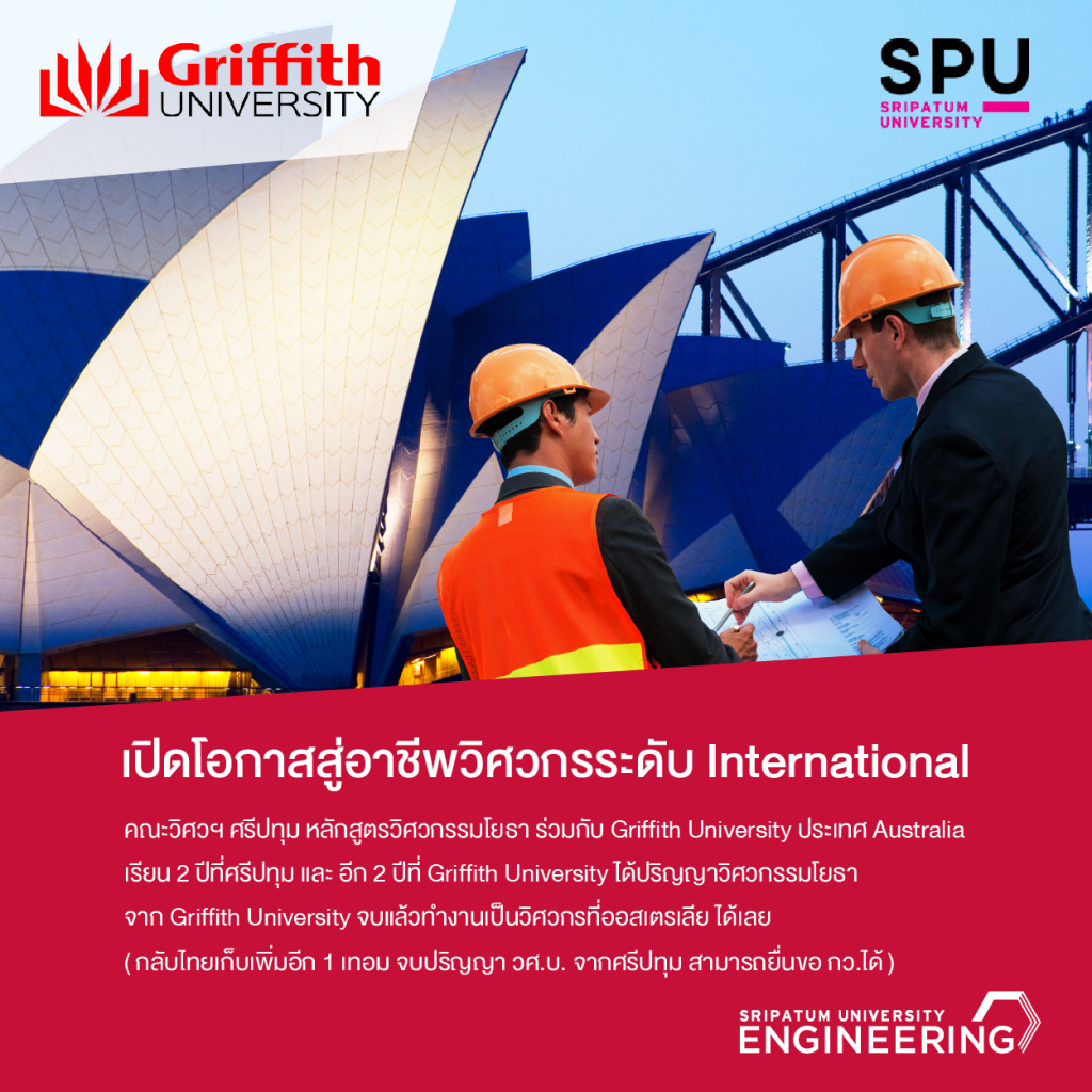 คณะวิศวฯ ศรีปทุม หลักสูตรวิศวกรรมโยธา ร่วมกับ Griffith University ประเทศ Australia เรียน 2 ปีที่ศรีปทุม และ อีก 2 ปีที่ Griffith University ได้รับปริญญาวิศวกรรมโยธา จาก Griffith University จบแล้วทำงานเป็นวิศวกรที่ออสเตรเลีย ได้เลย (กลับไทยเก็บเพิ่มอีก 1 เทอม จบปริญญา วศ.บ. จากศรีปทุม สามารถยื่นขอ กว. ได้)
