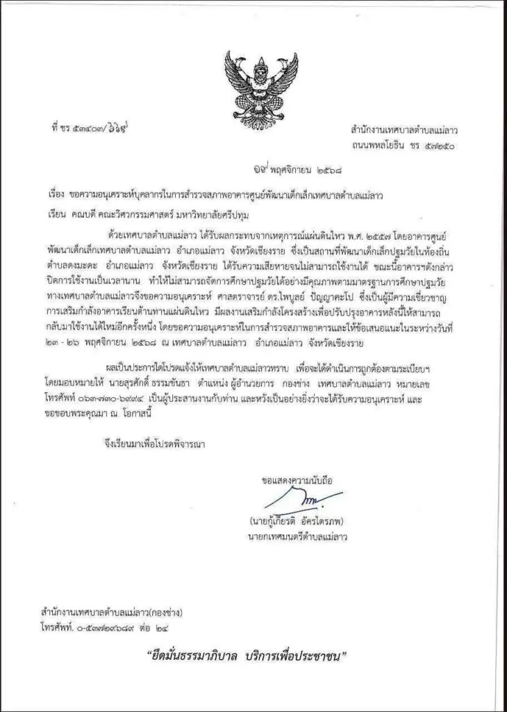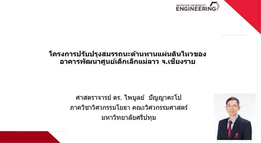 ศาสตราจารย์ ดร.ไพบูลย์ ปัญญาคะโป อาจารย์ประจำภาควิชาวิศวกรรมโยธา ได้รับเกียรติเข้าพบและนำเสนอผลการวิเคราะห์เบื้องต้นตาม หนังสือเชิญจากเทศบาลตำบลแม่ลาว จังหวัดเชียงราย เพื่อชี้แจงรายละเอียด “โครงการปรับปรุงสมรรถนะต้านทานแผ่นดินไหวของอาคารศูนย์พัฒนาเด็กเล็กแม่ลาว” ซึ่งได้รับผลกระทบจากเหตุการณ์แผ่นดินไหวในปี 2557 ส่งผลให้โครงสร้างอาคารเกิดความเสียหายและไม่สามารถใช้งานได้อย่างปลอดภัย
