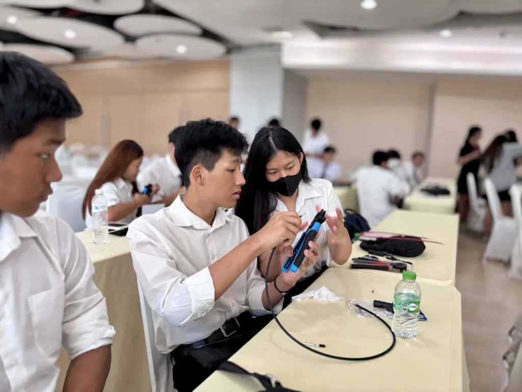 บรรยากาศภายในงานเป็นไปอย่างเข้มข้นและเป็นกันเอง นักศึกษาได้เรียนรู้จากวิศวกรผู้เชี่ยวชาญ พร้อมทดลองใช้อุปกรณ์จริง เช่น การปอกสาย การเข้าหัว MC4 การตรวจสอบความถูกต้องของการเชื่อมต่อ และการทดสอบระบบอย่างถูกวิธี นักศึกษามีความกระตือรือร้น ซักถาม แลกเปลี่ยนประสบการณ์ และลงมือปฏิบัติด้วยตนเองตลอดทั้งวัน