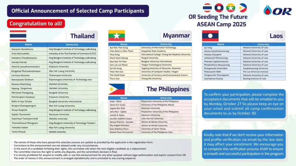 ที่ได้รับการคัดเลือกให้เข้าร่วมโครงการระดับอาเซียน “OR Seeding The Future ASEAN Camp 2025”