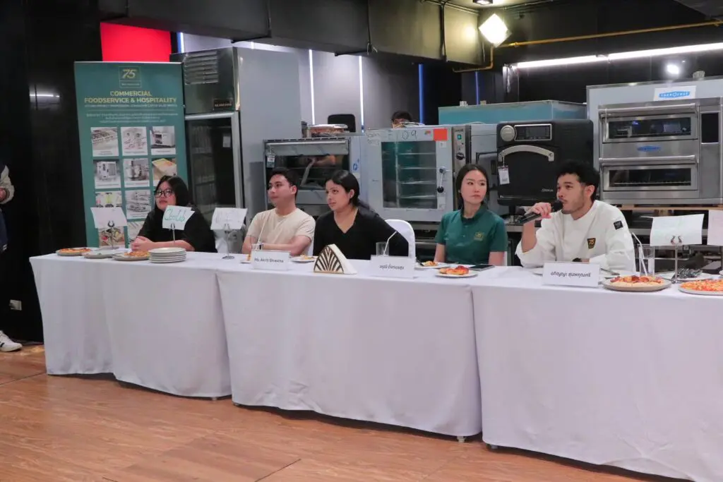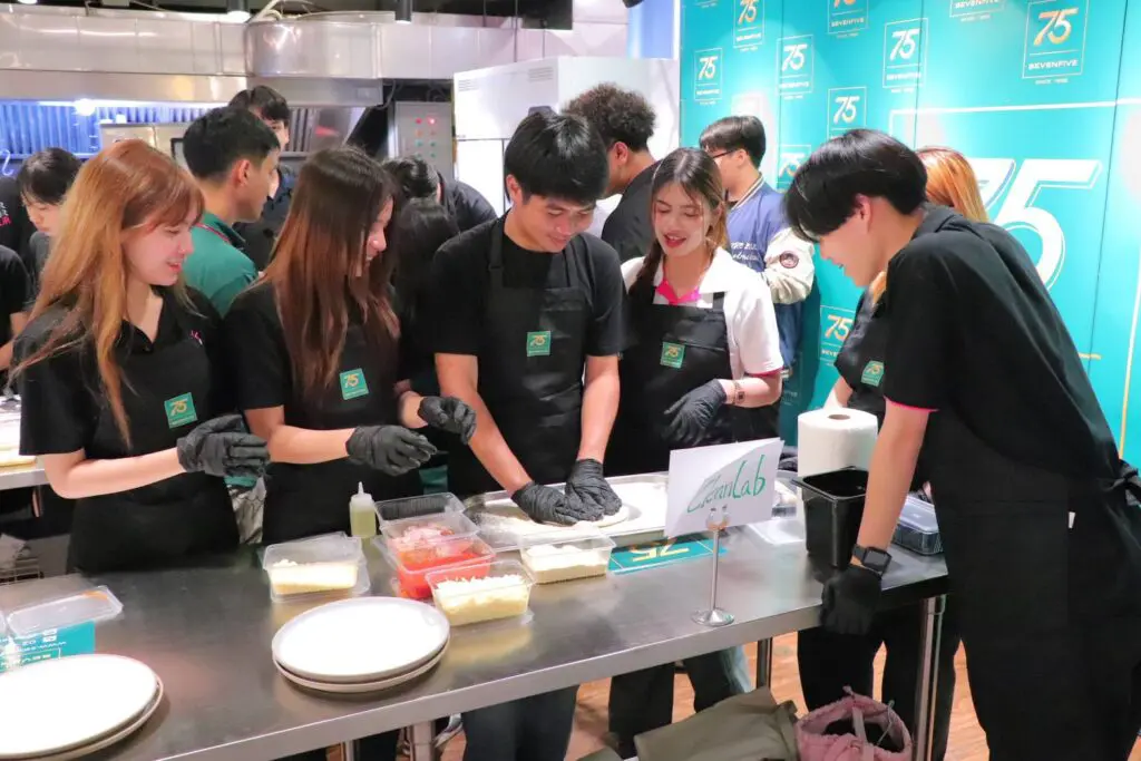 The afternoon session transformed theory into practice. Guided by the Corporate Chef, students learned pizza-making techniques and worked hands-on with the high-tech kitchen equipment introduced earlier in the day. Each team was then challenged to create a signature pizza designed for a specific target group. They presented both their pizza and their marketing poster to a judging panel consisting of the Corporate Chef, a professional nutritionist, and the CEO of Sevenfive Distributor Co., Ltd.
