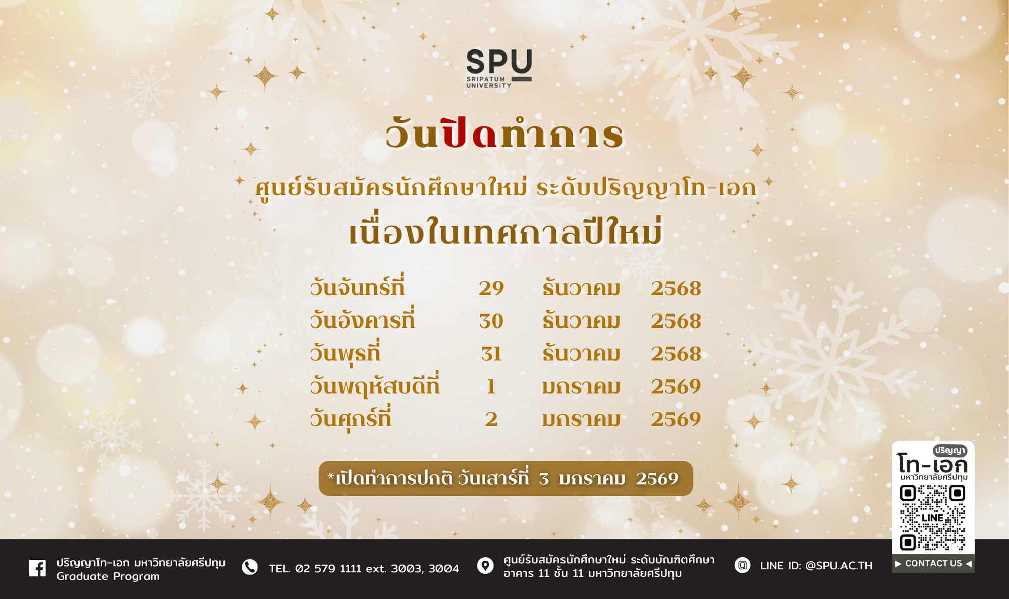 ประกาศแจ้งวันปิดทำการเนื่องในเทศกาลปีใหม่ ศูนย์รับสมัครนักศึกษาใหม่ ระดับบัณฑิตศึกษา มหาวิทยาลัยศรีปทุม