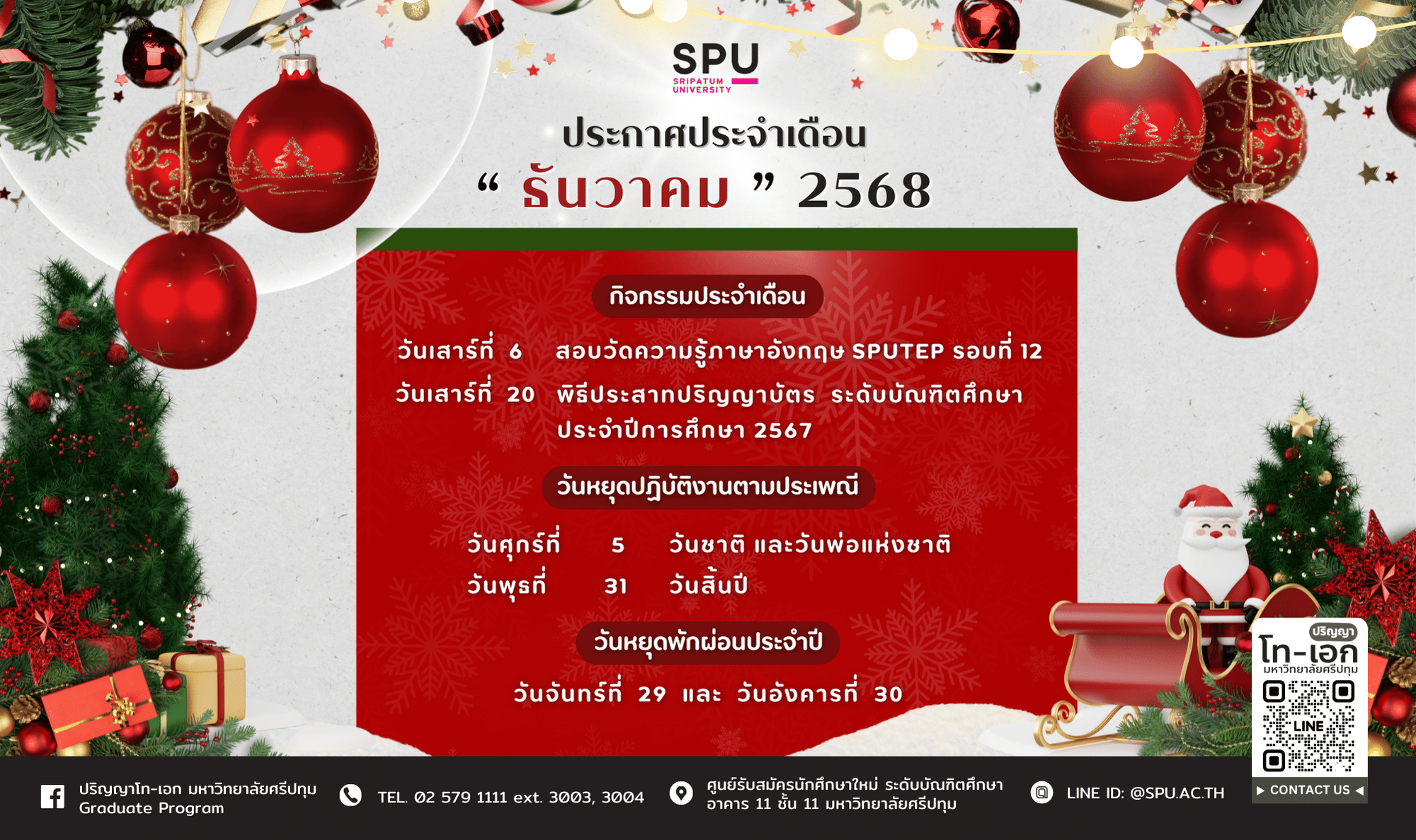 ประกาศประจำเดือนธันวาคม 2568 ศูนย์รับสมัครนักศึกษาใหม่ ระดับบัณฑิตศึกษา