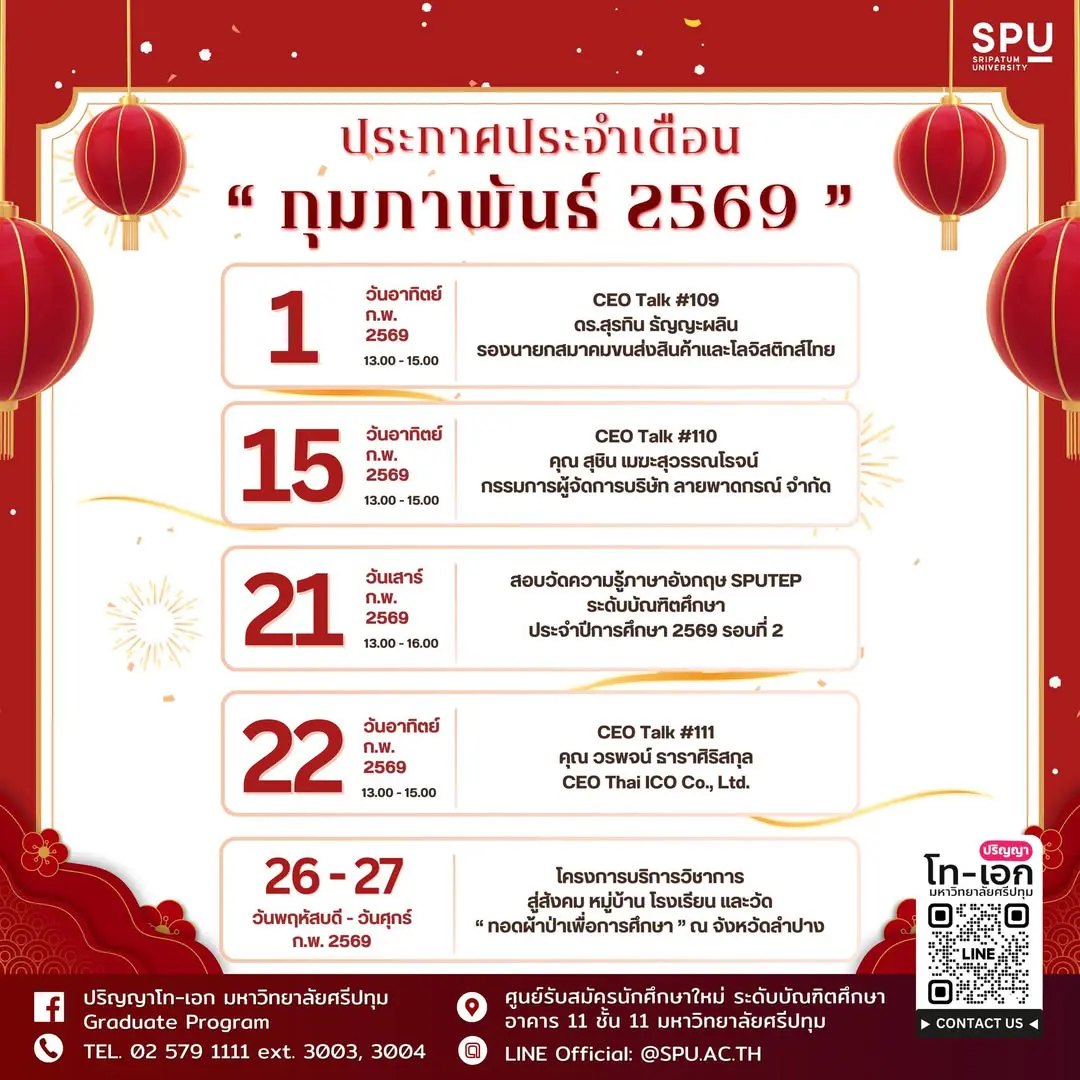 ศูนย์รับสมัครนักศึกษาใหม่ระดับบัณฑิตศึกษา มหาวิทยาลัยศรีปทุมประกาศกำหนดการกิจกรรม ประจำเดือนกุมภาพันธ์ 2569