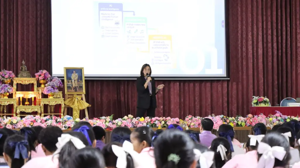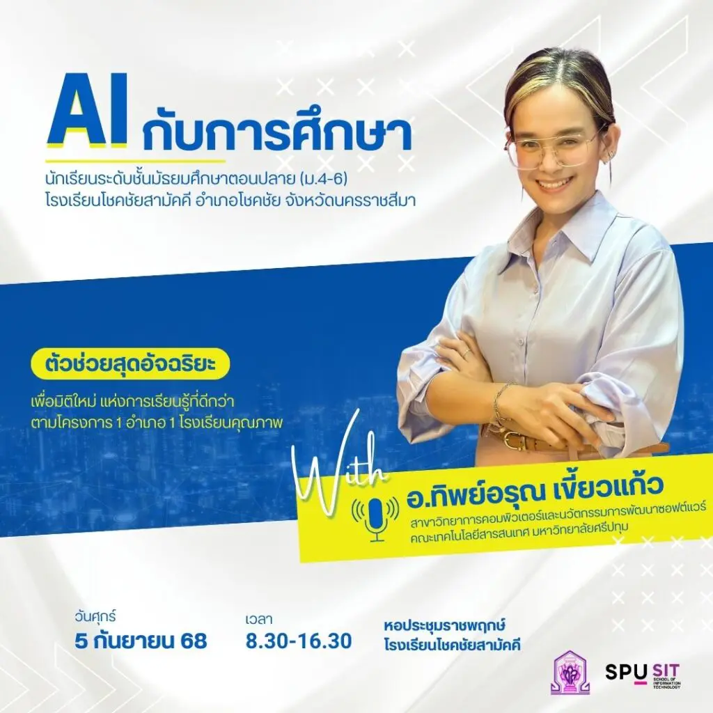 เมื่อวันที่ 5 กันยายน 2568 โรงเรียนโชคชัยสามัคคีได้จัดโครงการ “1 อำเภอ 1 โรงเรียนคุณภาพ” เพื่อส่งเสริมความรู้ด้านเทคโนโลยี AI สำหรับนักเรียนมัธยมศึกษาตอนปลาย ปี 4-6 โดยมีวิทยากรผู้เชี่ยวชาญ อาจารย์ทิพย์อรุณ เขี้ยวแก้ว จากคณะเทคโนโลยีสารสนเทศ มหาวิทยาลัยศรีปทุม บรรยายในหัวข้อ “การอบรมเชิงปฏิบัติการ AI กับการศึกษาตัวช่วยอัจฉริยะเพื่อมิติใหม่แห่งการเรียนรู้ที่ดีกว่า” ณ หอประชุมราชพฤกษ์ โรงเรียนโชคชัยสามัคคี