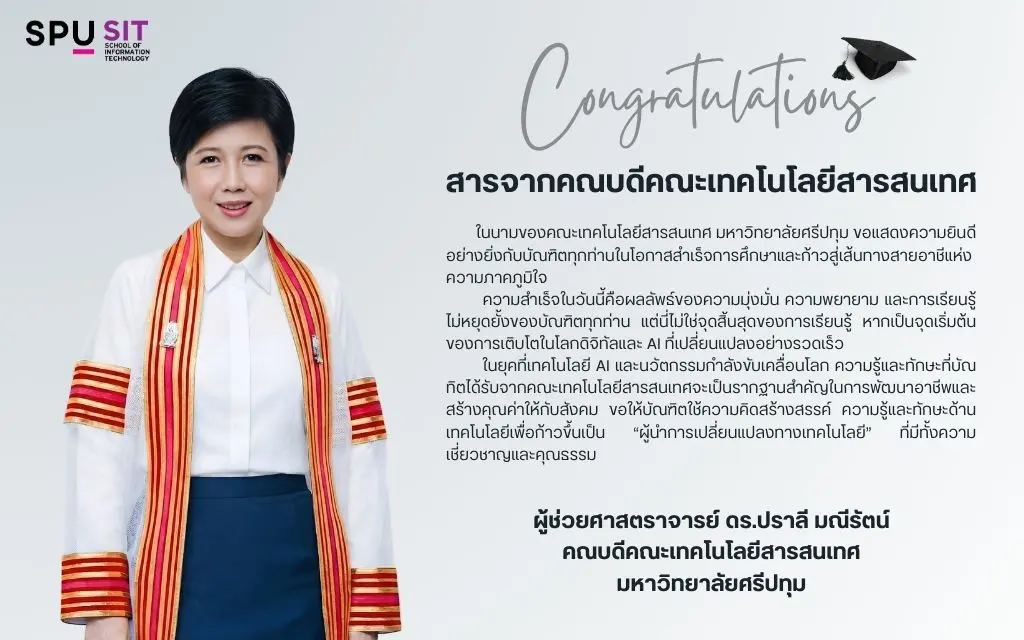 ในนามของคณะเทคโนโลยีสารสนเทศ มหาวิทยาลัยศรีปทุม ดิฉันขอแสดงความยินดีอย่างยิ่งกับบัณฑิตทุกท่าน ที่ได้สำเร็จการศึกษาในวันนี้ ความสำเร็จครั้งนี้เป็นผลจากความมุ่งมั่น ความพยายาม และการเรียนรู้อย่างไม่ย่อท้อของทุกคน ตลอดระยะเวลาที่ได้ก้าวเดินบนเส้นทางแห่งการศึกษาในรั้วมหาวิทยาลัย