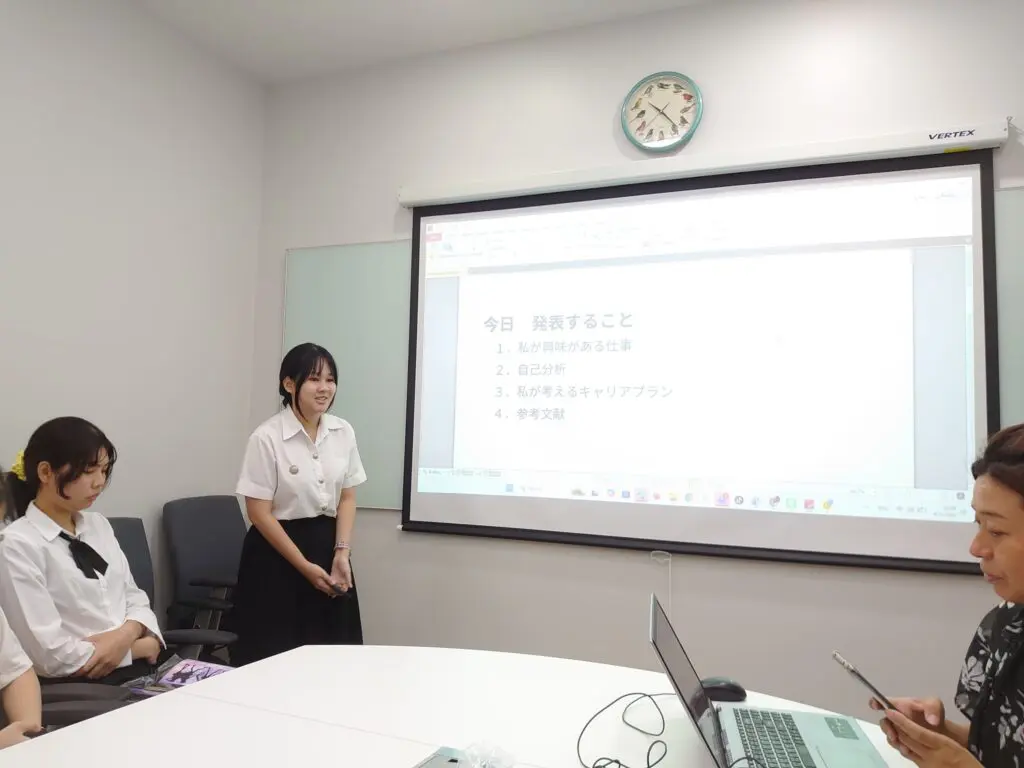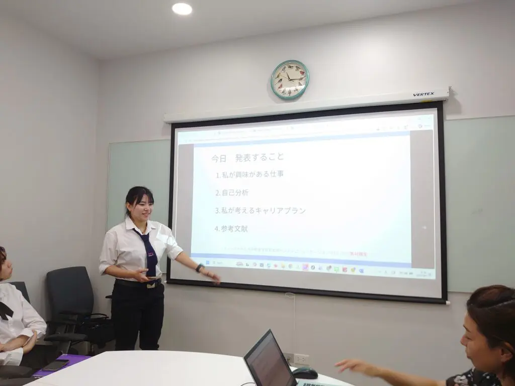 เมื่อวันพุธที่ 8 เมษายน 2569 ผู้ช่วยศาสตราจารย์ ดร. Yasumasa MORI ที่ปรึกษาคณบดีคณะศิลปะศาสตร์ด้านการต่างประเทศ ฝ่ายการต่างประเทศ และ อาจารย์ Aki TAKAHASHI อาจารย์ประจำแบบพิเศษ สาขาวิชาภาษาญี่ปุ่นเพื่อการสื่อสารธุรกิจ ได้มีโอกาสรับฟังการนำเสนอผลงานของนักศึกษาชั้นปีที่ 3 จำนวน 7 คน ซึ่งลงทะเบียนในรายวิชา “JBC498 วิชาเตรียมสหกิจศึกษาภาษาญี่ปุ่นเพื่อการสื่อสารธุรกิจ (Pre-Cooperative Education)” นักศึกษาทั้ง 7 คนนี้เป็นผู้ที่จะเข้าร่วมโครงการฝึกงาน ณ ประเทศญี่ปุ่น (จังหวัดคานากาวะ จังหวัดชิซูโอกะ จังหวัดชิมาเนะ) ประจำปีการศึกษา 2569 โดยเนื้อหาในการนำเสนอประกอบด้วย อาชีพที่สนใจ การวิเคราะห์ตนเอง และการวางแผนเส้นทางอาชีพ (Career Plan) ตามมุมมองของตนเอง