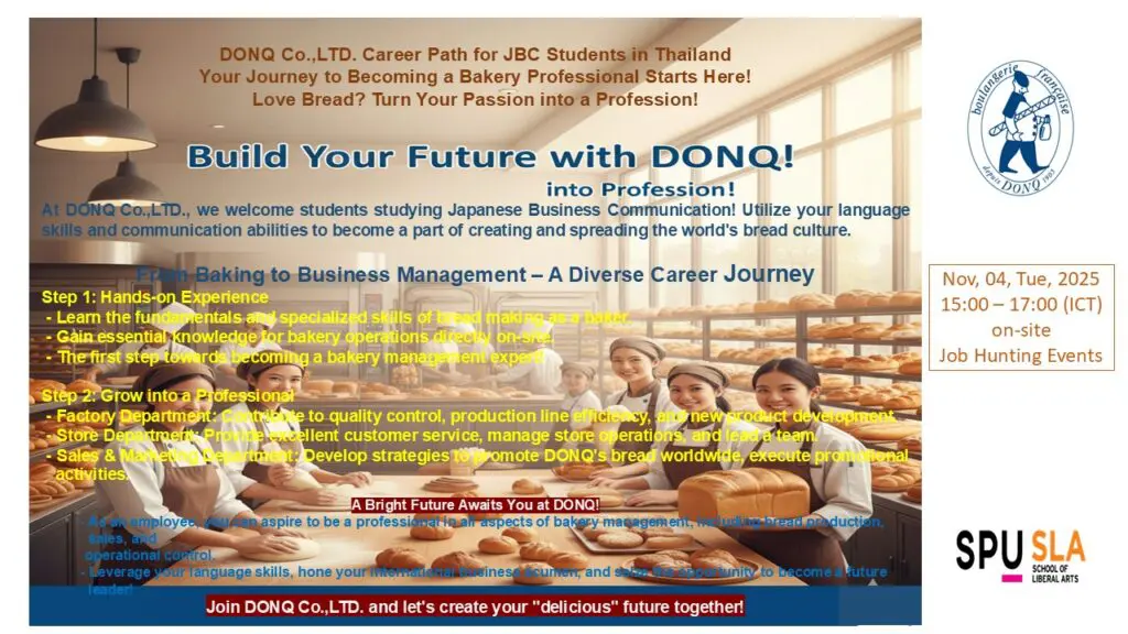 เมื่อวันอังคารที่ 4 พฤศจิกายน 2568 สาขาวิชาภาษาญี่ปุ่นเพื่อการสื่อสารธุรกิจ (JBC) คณะศิลปศาสตร์ ได้จัด สัมมนาข้อมูลบริษัท สำหรับนักศึกษาชั้นปีที่ 2 โดยได้รับเกียรติจากผู้บริหารจาก DONQ Co., Ltd. และ The Juridical Foundation for International Personnel Management (IPM)