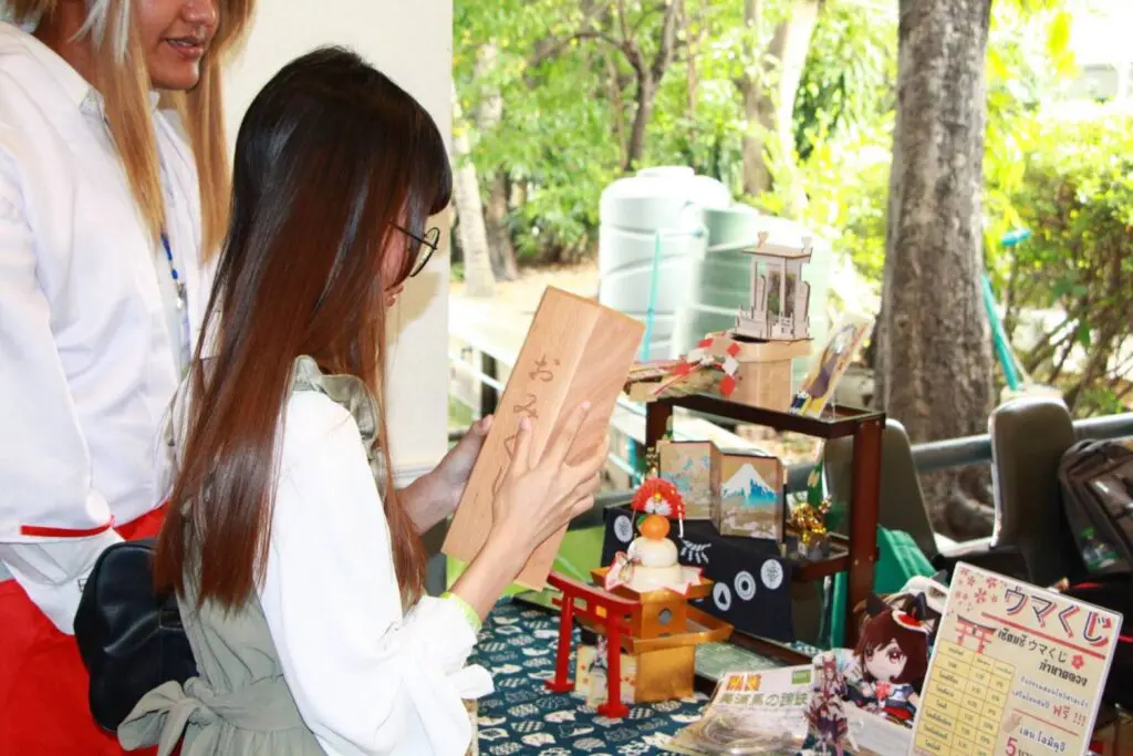 นักศึกษาสาขาวิชาภาษาญี่ปุ่นเพื่อการสื่อสารธุรกิจ ร่วมจัดบูทกิจกรรมวัฒนธรรมญี่ปุ่นในงาน UMA Party – Road to Derby ถ่ายทอดเสน่ห์ญี่ปุ่นผ่านการไหว้ขอพรแบบศาลเจ้า และการเสี่ยงดวง おみくじ อย่างสนุก เป็นกันเอง และเต็มไปด้วยรอยยิ้ม ![]()