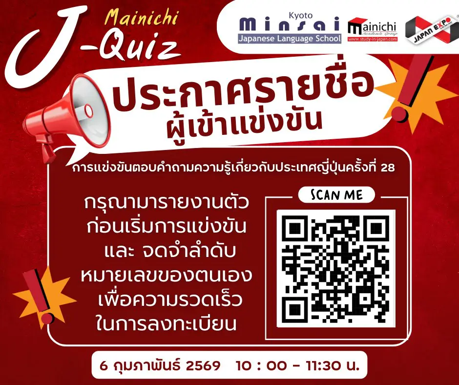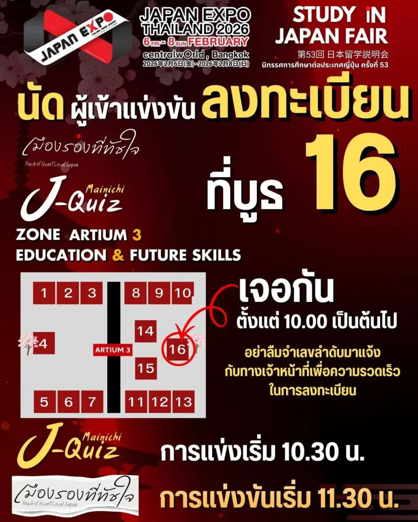นักศึกษาจากสาขาวิชาญี่ปุ่นเพื่อการสื่อสารธุรกิจ (JBC) ที่เข้าร่วมการแข่งขัน “J-Quiz ครั้งที่ 28 (Mainichi J-Quiz)” ซึ่งเป็นส่วนหนึ่งของงาน JAPAN EXPO THAILAND 2026 ณ เซ็นทรัลเวิลด์ แม้จะน่าเสียดายที่ครั้งนี้ไม่สามารถคว้ารางวัลมาได้ แต่นักศึกษา JBC ก็ได้แสดงความสามารถอย่างเต็มที่และทำผลงานได้อย่างยอดเยี่ยม เป็นกำลังใจให้นักศึกษา JBC พยายามต่อไปเพื่อคว้าชัยชนะในครั้งหน้า