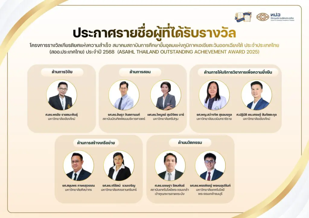 ที่ได้รับรางวัลเกียรติยศแห่งความสำเร็จ สมาคมสถาบันการศึกษาขั้นอุดมแห่งภูมิภาคเอเชียตะวันออกเฉียงใต้ ประจำประเทศไทย (อสอ.ประเทศไทย) ประจำปี 2568 (ASAIHL THAILAND OUTSTANDING ACHIEVEMENT AWARD 2025) อาจารย์ดีเด่นด้านการสอน