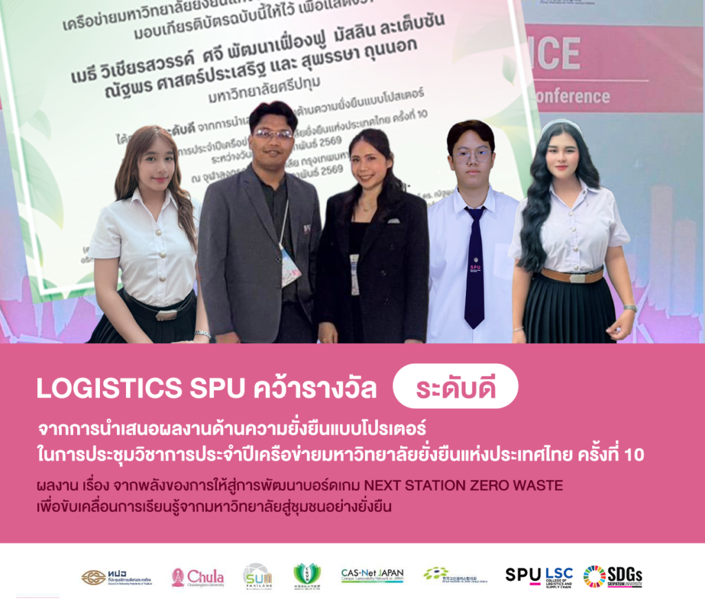 จากเวทีประชุมวิชาการเครือข่ายมหาวิทยาลัยยั่งยืนแห่งประเทศไทย ครั้งที่ 10 วิทยาลัยโลจิสติกส์และซัพพลายเชน มหาวิทยาลัยศรีปทุม สร้างความภาคภูมิใจอีกครั้ง ด้วยการคว้า รางวัลระดับดี จากการนำเสนอผลงานด้านความยั่งยืนแบบโปสเตอร์ ในการประชุมวิชาการประจำปีเครือข่ายมหาวิทยาลัยยั่งยืนแห่งประเทศไทย ครั้งที่ 10