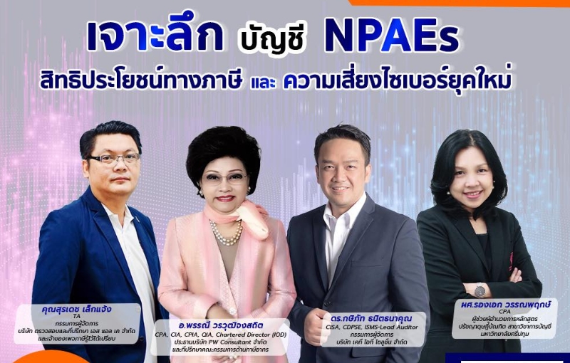 ปิดท้ายด้วยการอบรมนับชั่วโมง CPA/CPD ด้านบัญชี 11 ชั่วโมง ด้านอื่นๆ 6 ชั่วโมงและด้านจรรยาบรรณ 1 ชั่วโมง ในหัวข้อ “เจาะลึกบัญชีNPAEs สิทธิประโยชน์ทางภาษี และ ความเสี่ยงไซเบอร์ยุคใหม่” โดย คุณพรรณี วรวุฒิจงสถิตย์ CPA, CIA, CPIA, QIA, Chartered Director (IOD), ดร.กษิภัท ธนิตธนาคุณ (CISA, CDPSE, ISMS-Lead Auditor), คุณสุรเดช เล็กแจ้ง (TA) และ ผศ.รองเอก วรรณพฤกษ์ (CPA) เพื่อยกระดับความรู้ความเข้าใจด้านบัญชี NPAEs และสิทธิประโยชน์ทางภาษี ตลอดจนสร้างความตระหนักและทักษะการรับมือกับความเสี่ยงไซเบอร์ยุคใหม่ ให้กับผู้ประกอบวิชาชีพบัญชี ในวันที่ 18-19 และ 25 ตุลาคม 2568 เวลา 08.30-17.00 น. ผ่านระบบ Zoom Online