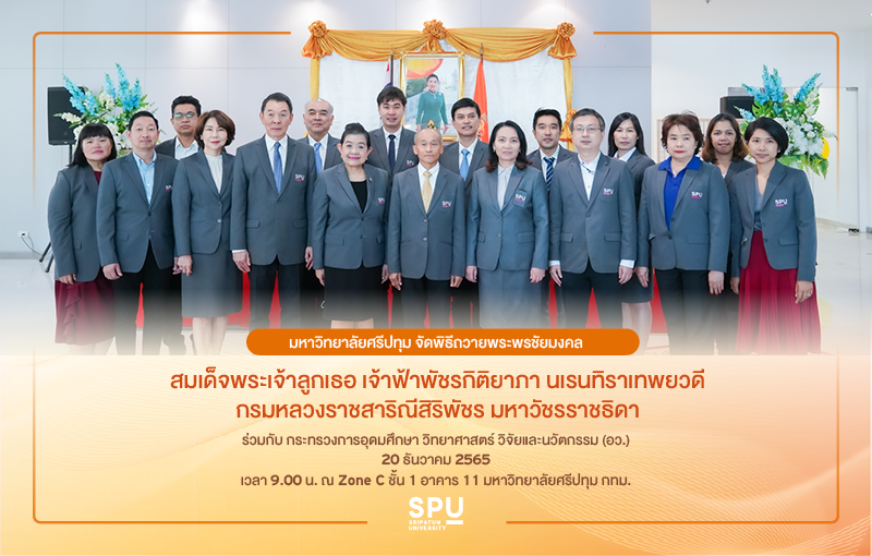 ในการนี้ ดร.โสภิต ภาโนมัย รองอธิการบดี มหาวิทยาลัยศรีปทุม ได้เป็นผู้แทนอธิการบดี นำคณะผู้บริหาร คณาจารย์ บุคลากร และนักศึกษา จัดพิธีถวายพระพรชัยมงคล แด่สมเด็จพระเจ้าลูกเธอ เจ้าฟ้าพัชรกิติยาภา นเรนทิราเทพยวดี กรมหลวงราชสาริณีสิริพัชร มหาวัชรราชธิดา พร้อมกัน เพื่อขอให้ทรงมีพระพลานามัยแข็งแรงสมบูรณ์และให้ทรงหายจากพระอาการประชวรในเร็ววัน ณ Exhibitions Hall Zone C ชั้น 1 อาคาร 11 มหาวิทยาลัยศรีปทุม กทม.(บางเขน) รวมถึงได้ร่วมลงนามถวายพระพรผ่านระบบออนไลน์ด้วย