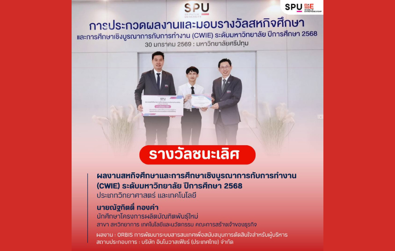 คณะการสร้างเจ้าของธุรกิจ มหาวิทยาลัยศรีปทุม สร้างความภาคภูมิใจอีกครั้ง ด้วยการคว้า 3 รางวัลผลงานสหกิจศึกษาและการศึกษาเชิงบูรณาการกับการทำงาน (CWIE) ระดับมหาวิทยาลัย ประจำปีการศึกษา 2568 ได้แก่ รางวัลชนะเลิศ ด้านวิทยาศาสตร์และเทคโนโลยี, รางวัลรองชนะเลิศอันดับสอง ด้านสังคมศาสตร์และมนุษยศาสตร์ และ รางวัลชมเชย ด้านเทคโนโลยีและนวัตกรรม สะท้อนความสำเร็จของแนวทางการจัดการเรียนการสอนที่เชื่อม “ห้องเรียน–สถานประกอบการ” อย่างเป็นรูปธรรม