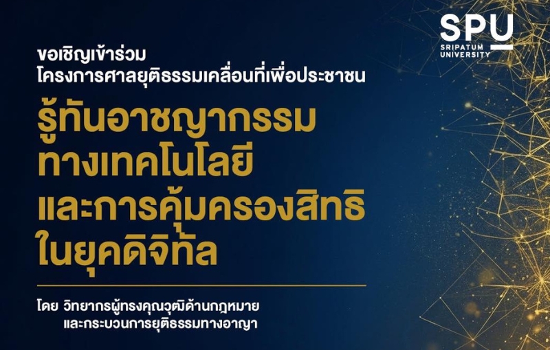 คณะนิติศาสตร์ มหาวิทยาลัยศรีปทุม (SPU) มุ่งเสริมสร้างความรู้ด้านกฎหมายและการคุ้มครองสิทธิในยุคดิจิทัล เชิญชวนนักศึกษาเข้าร่วมโครงการ ศาลยุติธรรมเคลื่อนที่เพื่อประชาชน เพื่อเรียนรู้และทำความเข้าใจประเด็นสำคัญเกี่ยวกับอาชญากรรมทางเทคโนโลยี พร้อมเปิดมุมมองด้านกฎหมายใกล้ตัว ทั้งนวัตกรรมศาลยุติธรรม การคุ้มครองสิทธิ สิทธิในกระบวนการยุติธรรม ตลอดจนการเจาะลึกแนวทางกฎหมายและการสู้คดีจากผู้เชี่ยวชาญตัวจริง