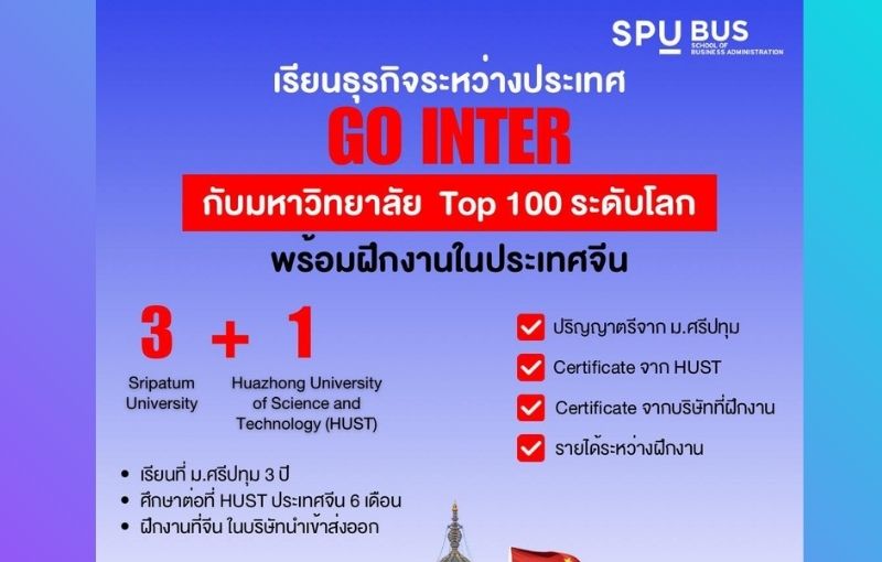 คณะบริหารธุรกิจ มหาวิทยาลัยศรีปทุม (SPU) เปิดประสบการณ์การเรียนรู้โลกธุรกิจระดับนานาชาติ ผ่านหลักสูตร 3+1 สาขาธุรกิจระหว่างประเทศ ร่วมกับ Huazhong University of Science and Technology (HUST) มหาวิทยาลัยชั้นนำระดับ Top 100 ของโลก และ Top 8 ของประเทศจีน สร้างโอกาสให้นักศึกษาได้เรียนรู้และลงสนามจริงในตลาดธุรกิจจีนอย่างแท้จริง