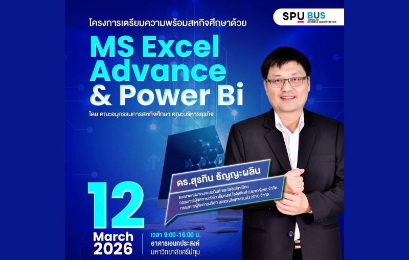 การอบรมจะมีขึ้นในวันที่ 12 มีนาคม 2026 เวลา 09.00–16.00 น. ณ อาคารเอนกประสงค์ มหาวิทยาลัยศรีปทุม กทม. ผู้เข้าร่วมจะได้พัฒนาความสามารถในการใช้ MS Excel ขั้น Advance อย่างมืออาชีพ เข้าใจการใช้ Power BI เพื่อวิเคราะห์และแสดงผลข้อมูลอย่างมีประสิทธิภาพ ต่อยอดสู่การทำงานสหกิจศึกษาและการทำงานในอนาคต เหมาะสำหรับนักศึกษาที่ต้องการเก่งเครื่องมือจริง ทำงานได้จริง และพร้อมเข้าสู่โลกการทำงานอย่างมั่นใจ