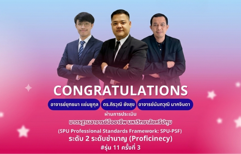มหาวิทยาลัยศรีปทุม (SPU) ขอแสดงความยินดีกับ ดร.ถิรวุฒิ ยังสุข, อ.นันทวุฒิ นาคจินดา และ อ.ยุทธนา แช่มชูกุล ที่ผ่านการประเมินมาตรฐานอาจารย์มืออาชีพ มหาวิทยาลัยศรีปทุม (SPU Professional Standards Framework: SPU-PSF) รุ่นที่ 11 ครั้งที่ 3 ในระดับ 2 ระดับชำนาญ (Proficiency) สะท้อนถึงศักยภาพด้านการจัดการเรียนการสอน การพัฒนาผู้เรียน และความเป็นมืออาชีพของคณาจารย์ตามมาตรฐานการศึกษาระดับสากล