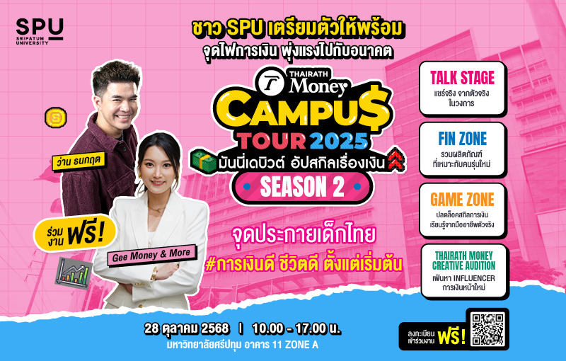 มหาวิทยาลัยศรีปทุม (SPU) เตรียมต้อนรับความสนุกและสาระครั้งใหญ่กับกิจกรรม THAIRATH Money CAMPUS TOUR 2025 – SEASON 2 ที่จะบุกมหาวิทยาลัยศรีปทุม พร้อมภารกิจ “มันนี่เดบิวต์ อัปสกิลเรื่องเงิน” จุดประกายเด็กไทยให้ #การเงินดี ชีวิตดี ตั้งแต่เริ่มต้น โดยทีมงาน ไทยรัฐมันนี่ นำทัพความรู้ด้านการเงินมาส่งตรงถึงรั้วมหาวิทยาลัย เพื่อสร้างแรงบันดาลใจให้คนรุ่นใหม่เข้าใจและวางแผนการเงินอย่างมีเป้าหมายตั้งแต่ช่วงชีวิตนักศึกษา ภายใต้คอนเซ็ปต์ “การเงินดี ชีวิตดี ตั้งแต่เริ่มต้น” เพื่อเตรียมความพร้อมสู่อนาคตทางการเงินที่มั่นคงอย่างยั่งยืน