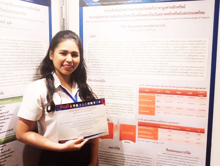 นางสาววิรันดา อิสมาแอล นักศึกษาเก่ง ระดับปริญญาตรี จากคณะบัญชี มหาวิทยาลัยศรีปทุม โชว์ศักยภาพในการนำเสนอผลงานวิจัย เรื่อง “การยกระดับงานวิจัยเพื่อขับเคลื่อนเศรษฐกิจและสังคมอย่างยั่งยืน” ในงานประชุมวิชาการระดับชาติและระดับนานาชาติ ครั้งที่ 4 ณ โรงแรม รอยัล ริเวอร์ กรุงเทพมหานคร เพื่อนำเสนอรายละเอียดการยกระดับงานวิจัยในการขับเคลื่อนเศรษฐกิจและสังคมของไทยได้อย่างยั่งยืน โดยมี อาจารย์พรรณทิพย์ อย่างกลั่น ผู้ช่วยคณบดีฝ่ายวิชาการ คณะบัญชี SPU เป็นอาจารย์ที่ปรึกษาฯ จัดโดย มหาวิทยาลัยเทคโนโลยีราชมงคลรัตนโกสินทร์ กรุงเทพฯ เมื่อเร็วๆนี้