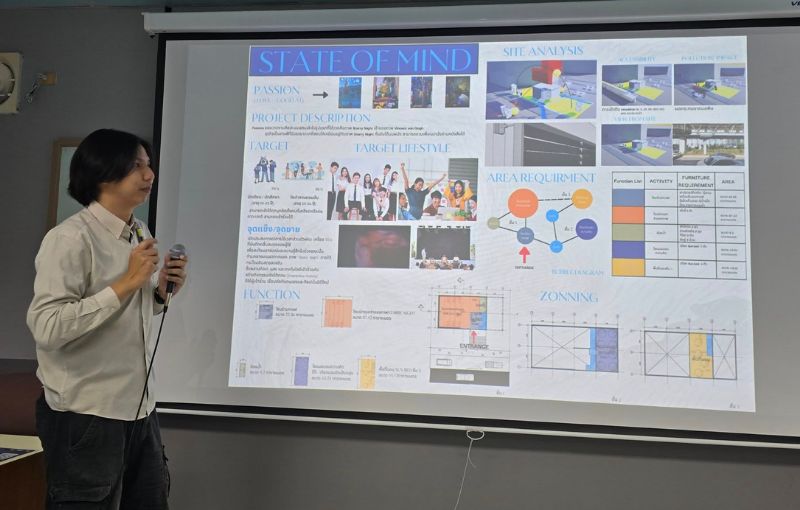 ดอย – ศตพร นักศึกษาชั้นปีที่ 3 สาขาการออกแบบภายใน คณะการออกแบบและสถาปัตยกรรมศาสตร์ มหาวิทยาลัยศรีปทุม โชว์แนวคิดผลงาน “STATE OF MIND” ธุรกิจ Community ด้านศิลปะและการพักผ่อนทางอารมณ์ โดยนำแรงบันดาลใจทางศิลปะ มาต่อยอดสู่การออกแบบพื้นที่ที่เชื่อมโยง “จิตใจ” ของผู้ใช้งานเข้ากับสเปซอย่างลึกซึ้ง