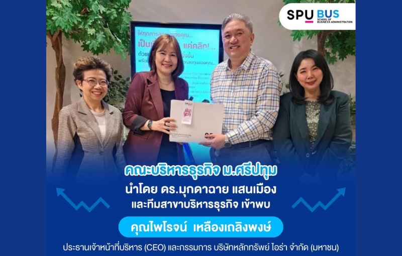 คณะบริหารธุรกิจ มหาวิทยาลัยศรีปทุม (SPU) นำโดย ดร.มุกดาฉาย แสนเมือง ผู้ช่วยคณบดีฝ่ายวิชาการ พร้อมคณาจารย์จากสาขาบริหารธุรกิจ เข้าหารือและแลกเปลี่ยนแนวทางความร่วมมือกับ คุณไพโรจน์ เหลืองเถลิงพงษ์ ประธานเจ้าหน้าที่บริหาร (CEO) และกรรมการ บริษัทหลักทรัพย์ ไอร่า จำกัด (มหาชน) เพื่อพัฒนาการเรียนการสอนให้เชื่อมโยงกับสถานประกอบการอย่างเป็นรูปธรรม