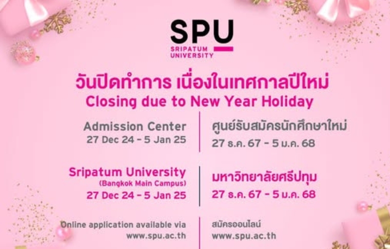 มหาวิทยาลัยศรีปทุม ประกาศขอแจ้งวันหยุดช่วงเทศกาลปีใหม่ ตั้งแต่ 27 ธ.ค. 67 – 5 ม.ค. 68